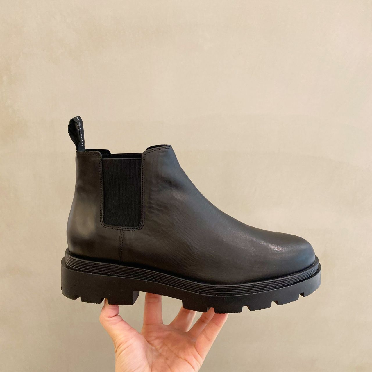 踵のロゴ入りプルストラップはお洒落だけでなく