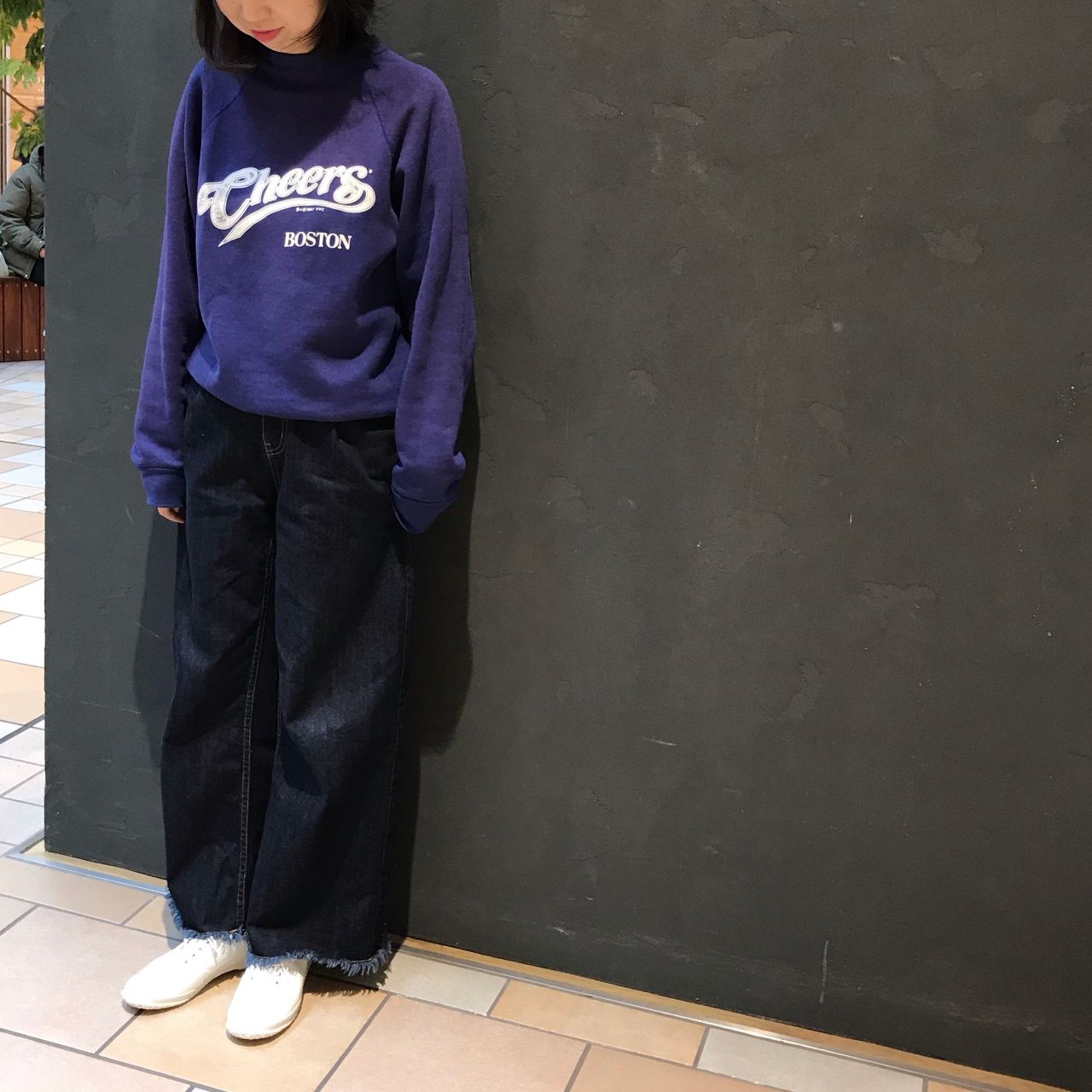 スウェットにラフなワイドデニムで。