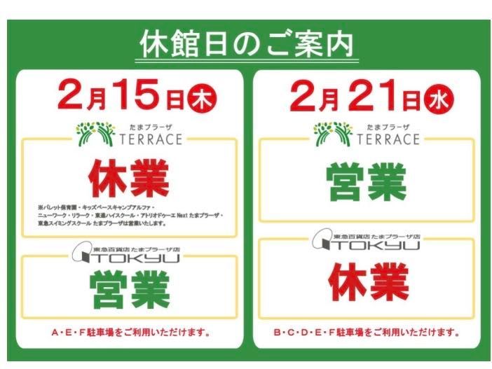 2月15日(木)は、たまプラーザテラス【全館休館日】となります。