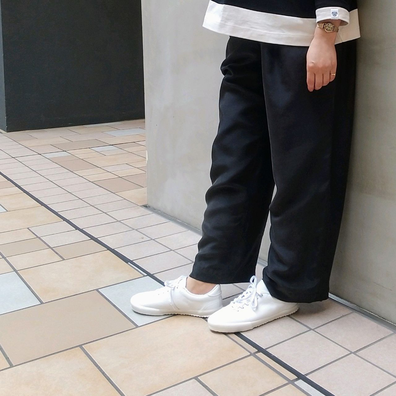 シンプルなレザースニーカーは、どんなコーディネートも合わせやすく、大人カジュアルにぴったりです。