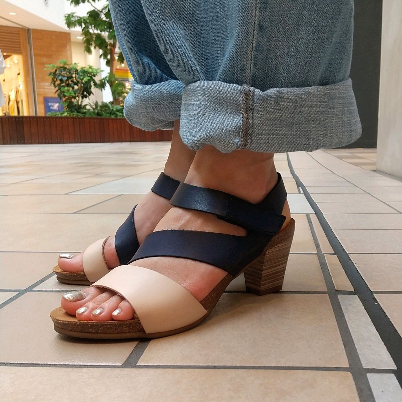 コンビカラーのヒールサンダル。