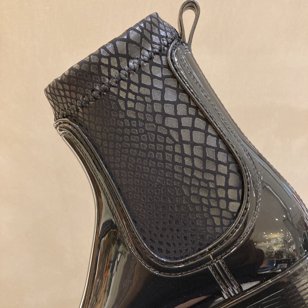 ファスナー周りは型押し風のストレッチ素材で、大人っぽさと高級感を演出してくれるデザインです。