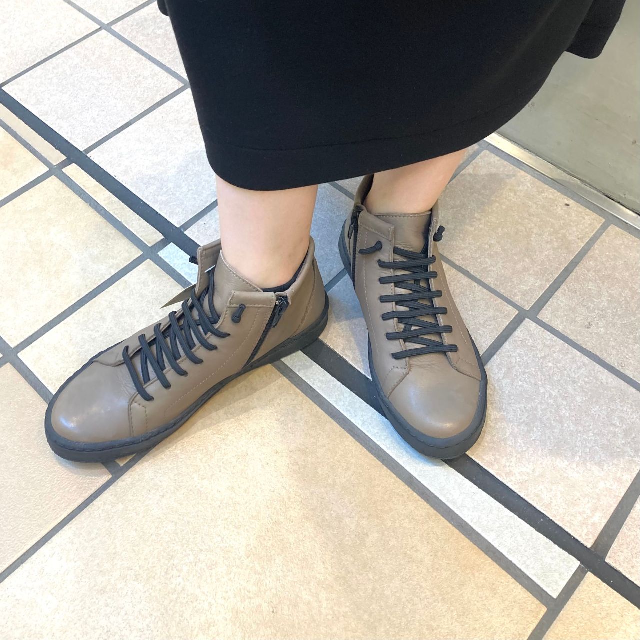 ゴムのシューレースは足に気持ちよくフィットし、サイドにジップが付いているので脱ぎ履きがとっても楽♪