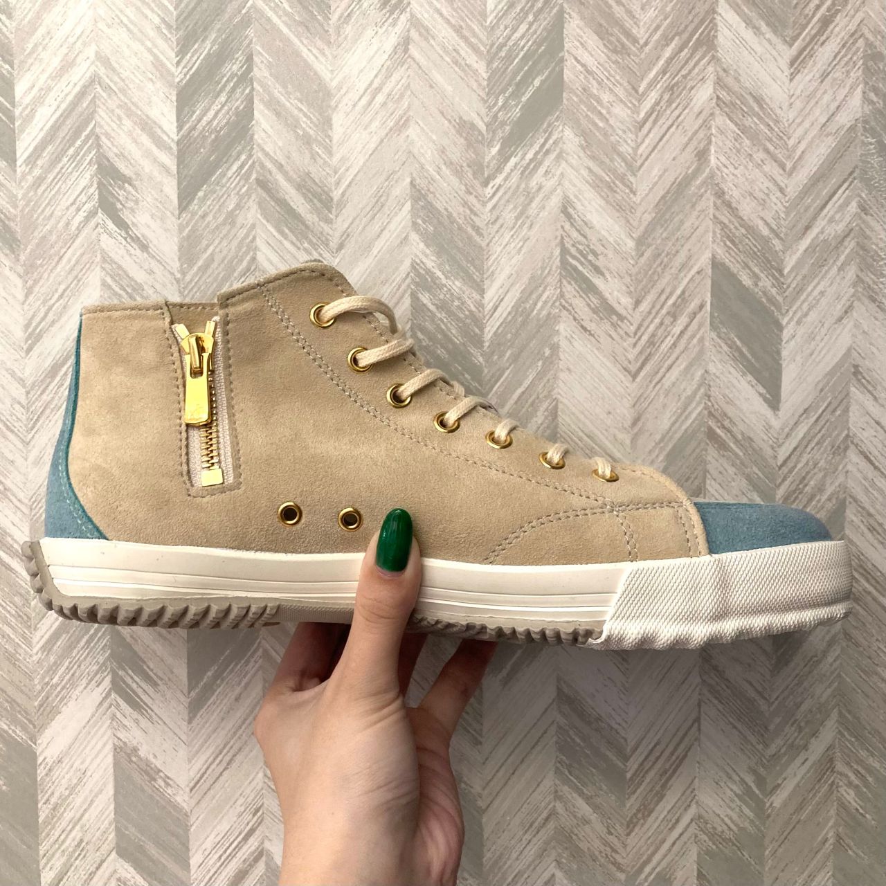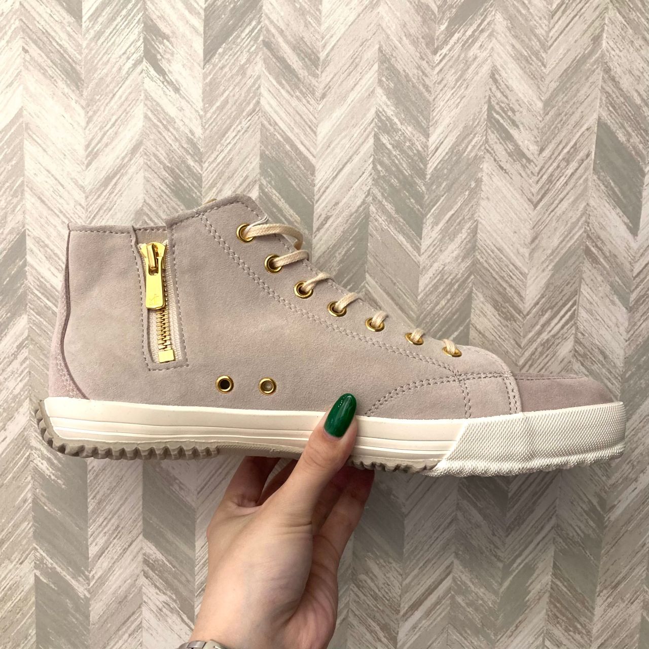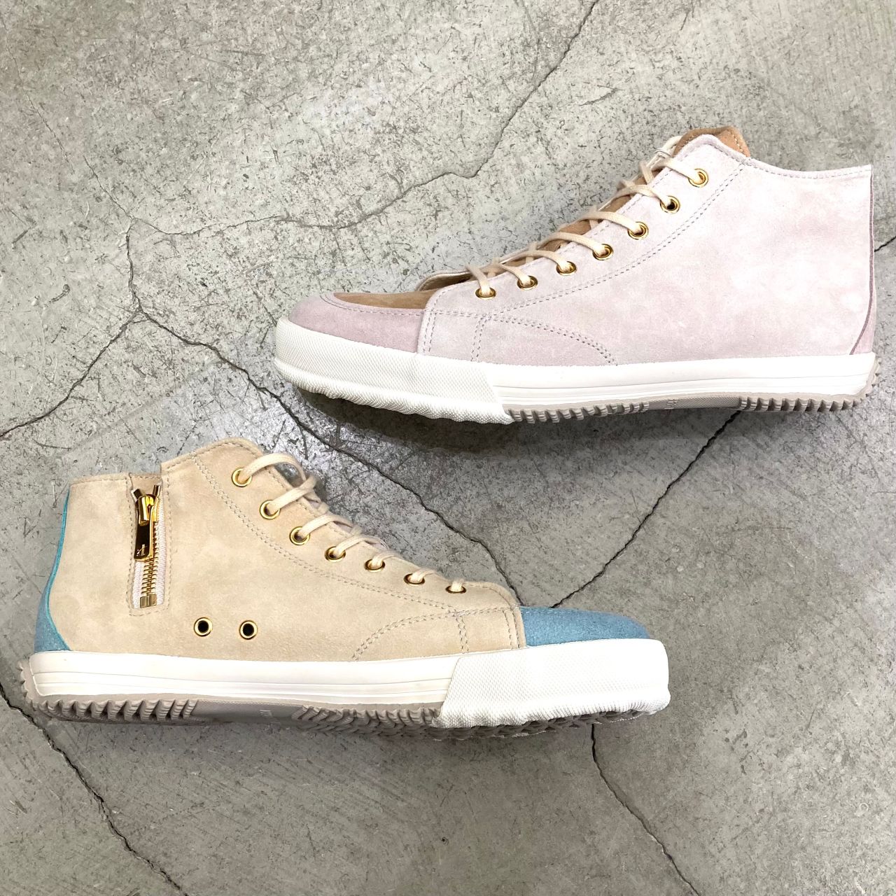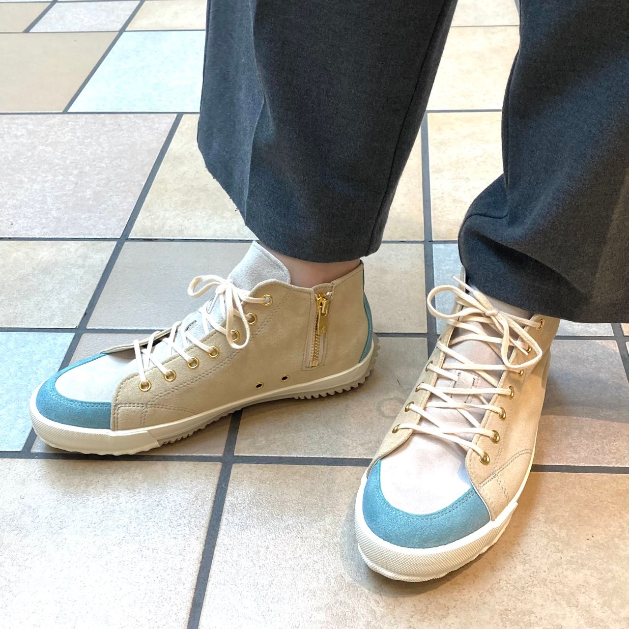 柔らかいタッチの山羊の革(ゴートスエード)を使用し、暖色を貴重とした女性らしい配色のミドルカット。
