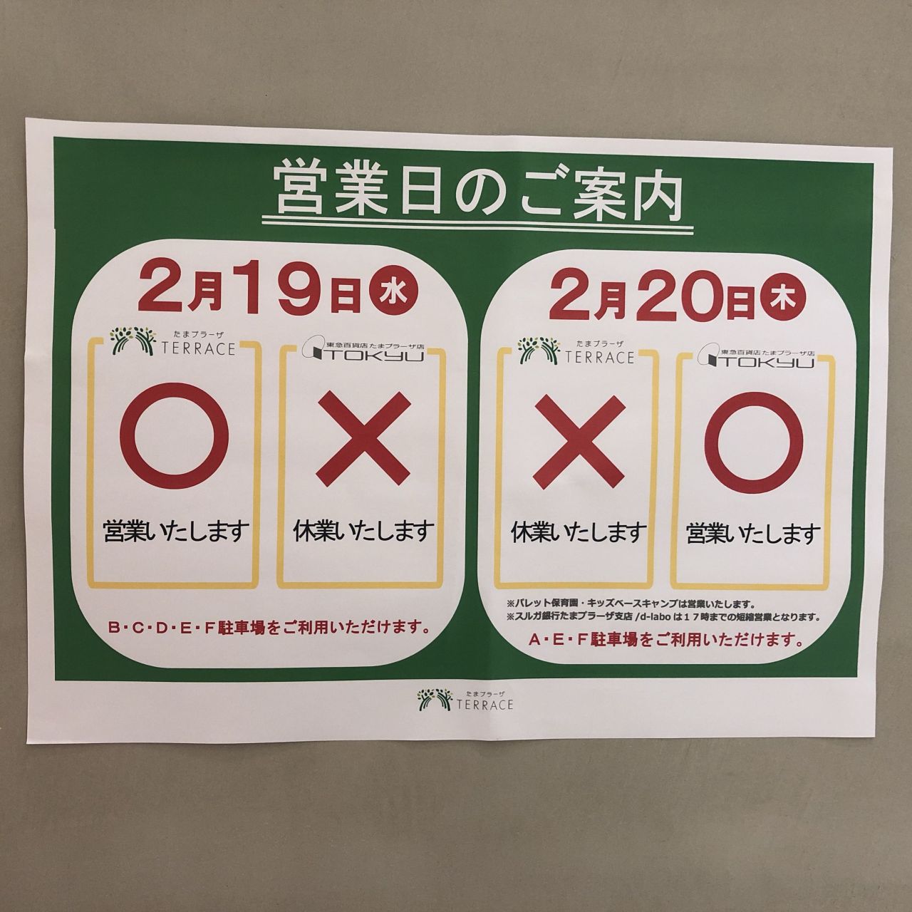 また、2/20(木)はたまプラーザテラス休館日でございます。