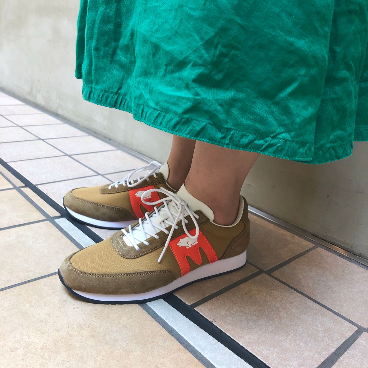 レトロな配色と、スウェードとナイロン素材のコンビネーションも遊び心があります。