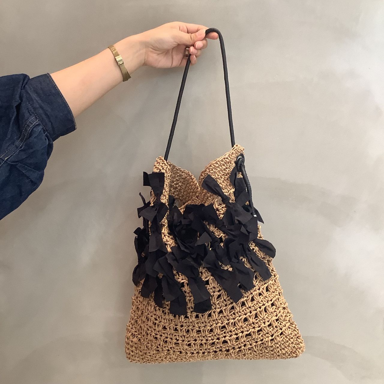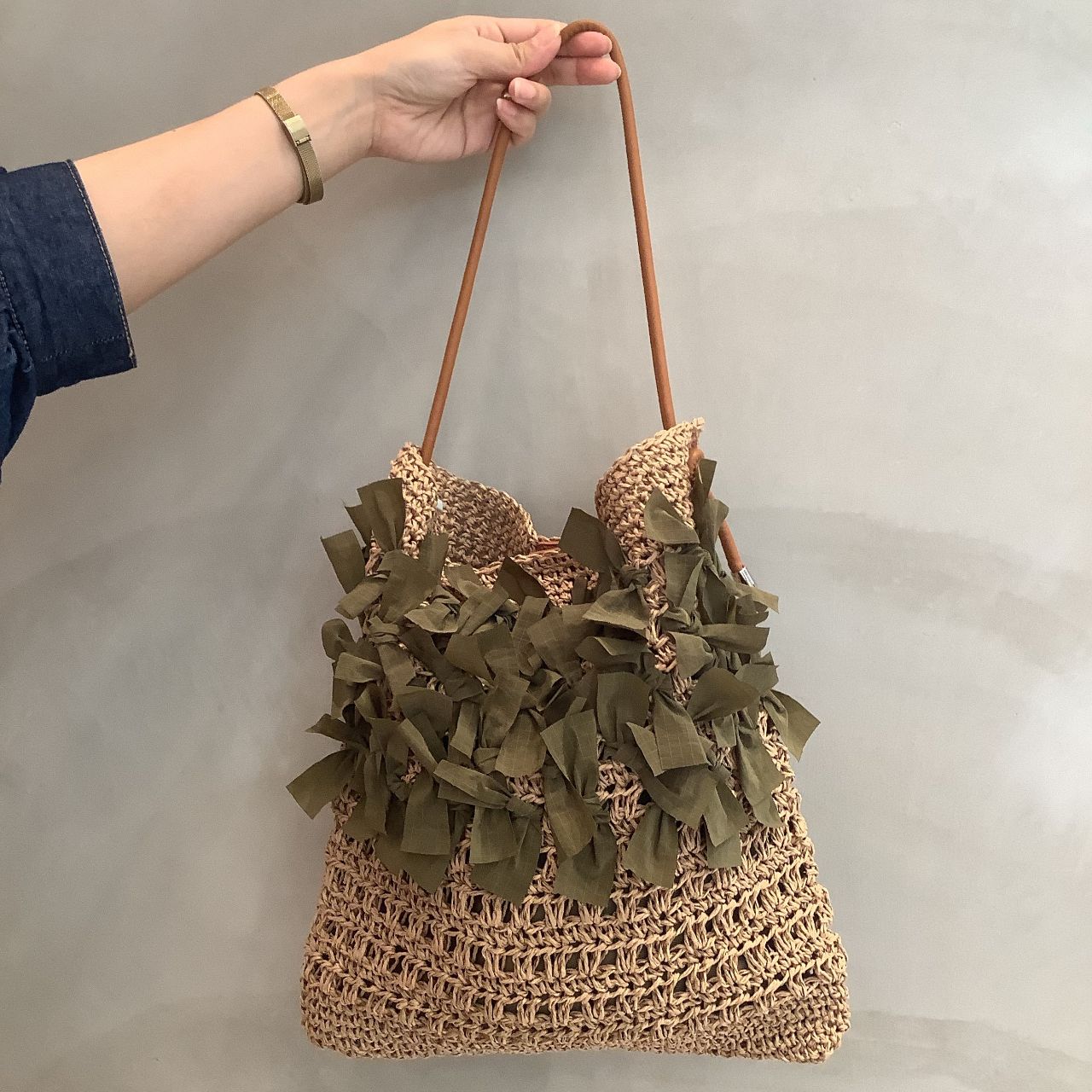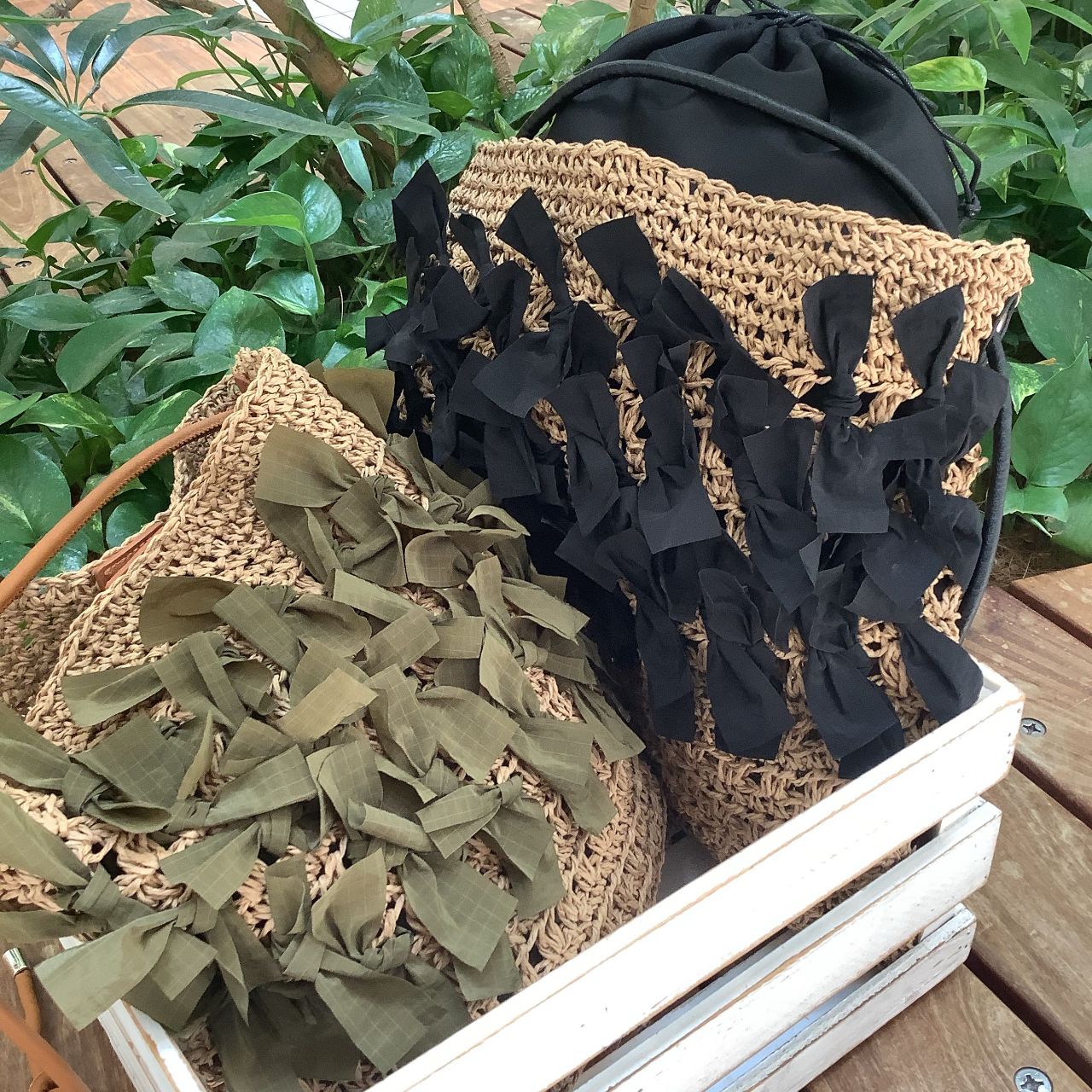 口元に取り付けたリボン状のナイロンがお花やフリルのように見える1本手トートバッグです。細いショルダーが女性らしく本体の透かし編みが涼し気です。長財布や500mlボトルが入るサイズで投げ込みの巾着付きで、とても軽量なバッグとなっております♪