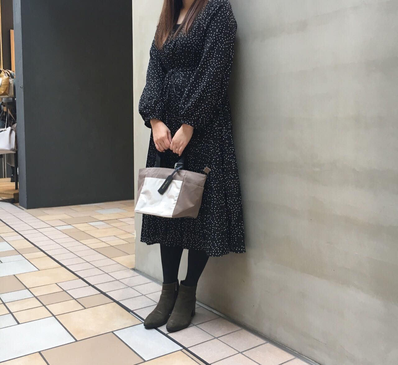 ドット柄のワンピースに、落ち着いたGRYを合わせてみました♪