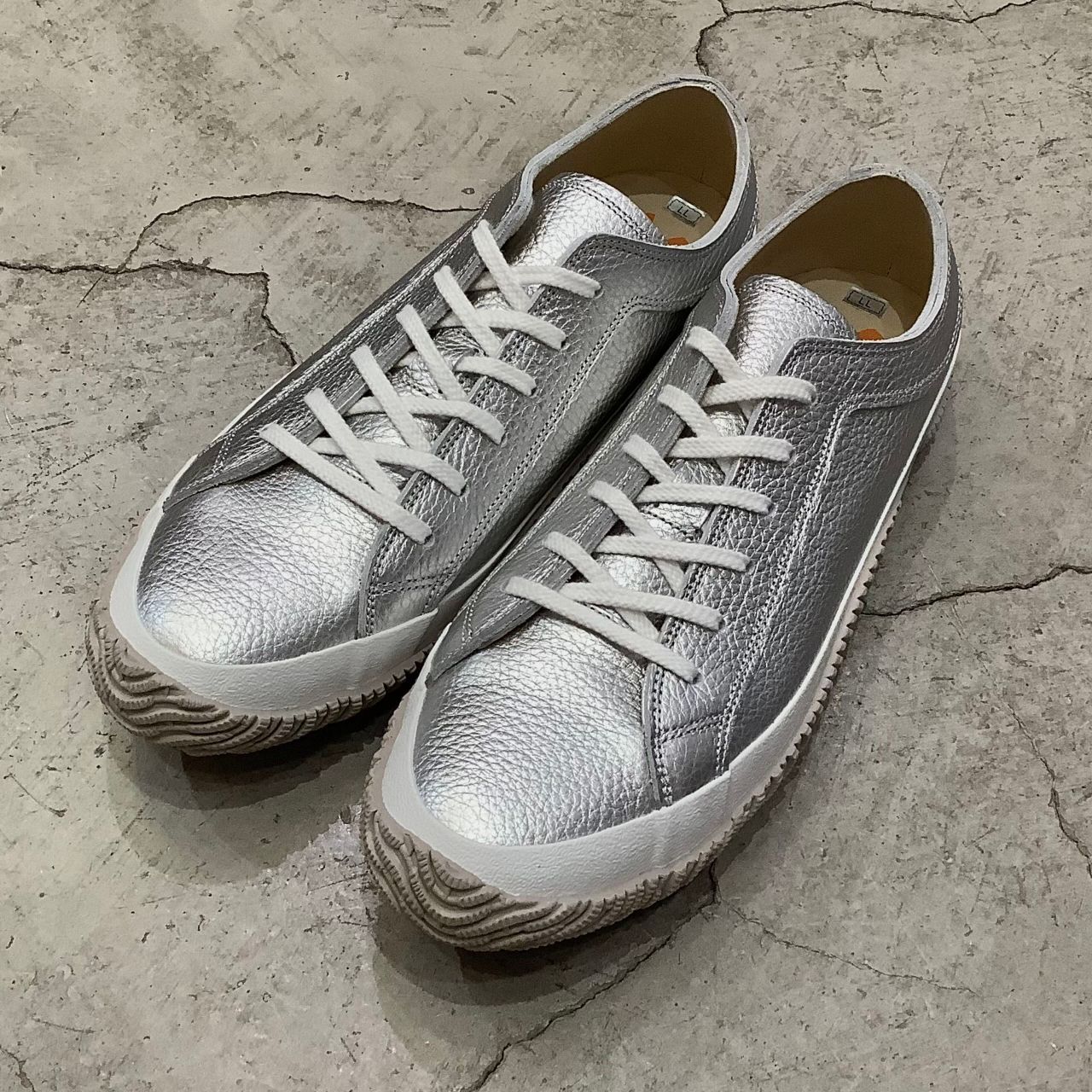 アッパーのシルバーをホワイトとグレーのソールで組み合わせています。