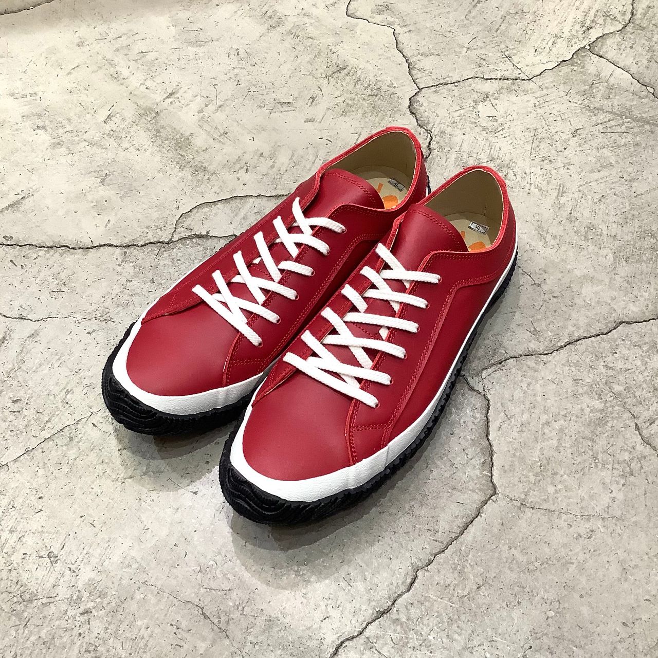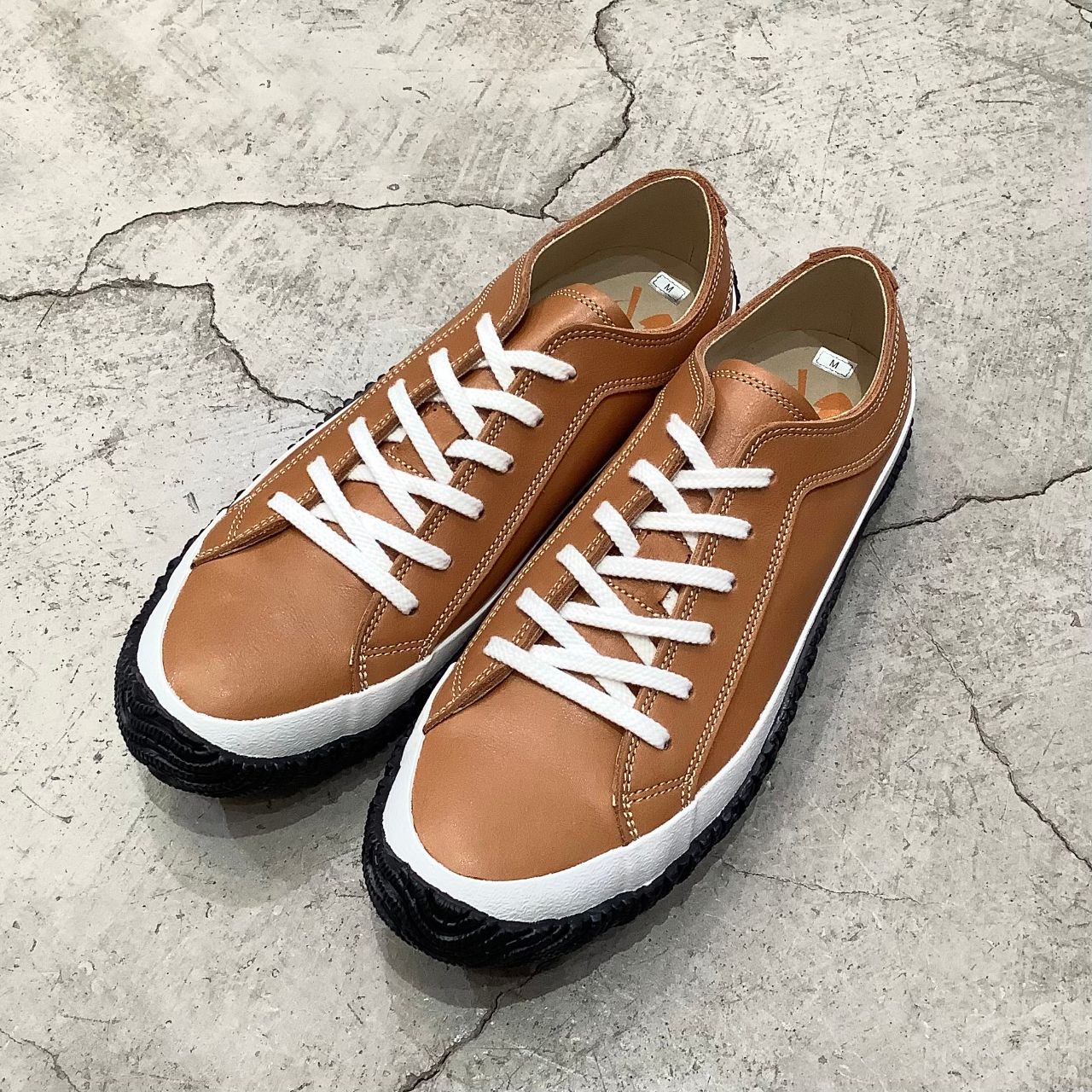 アンティークキャメルのアッパーにホワイトのフォクシングテープとブラックのソール。