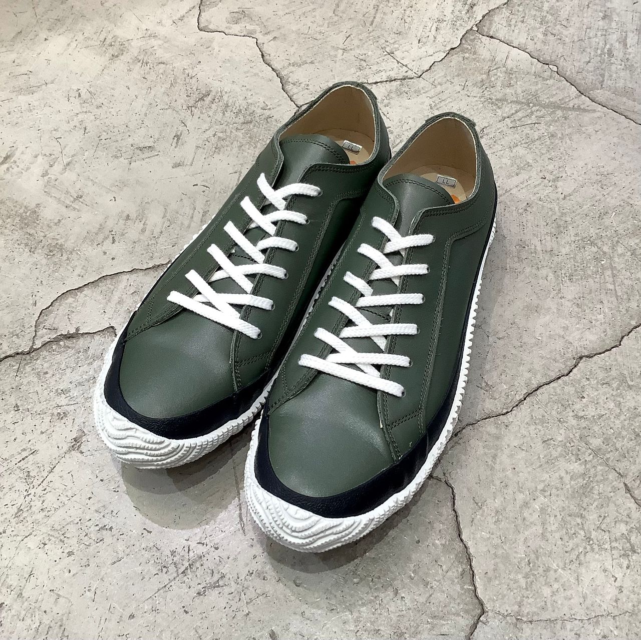カーキのアッパーをブラックのフォクシングで引き締めて、ホワイトのソールで軽さを表現。