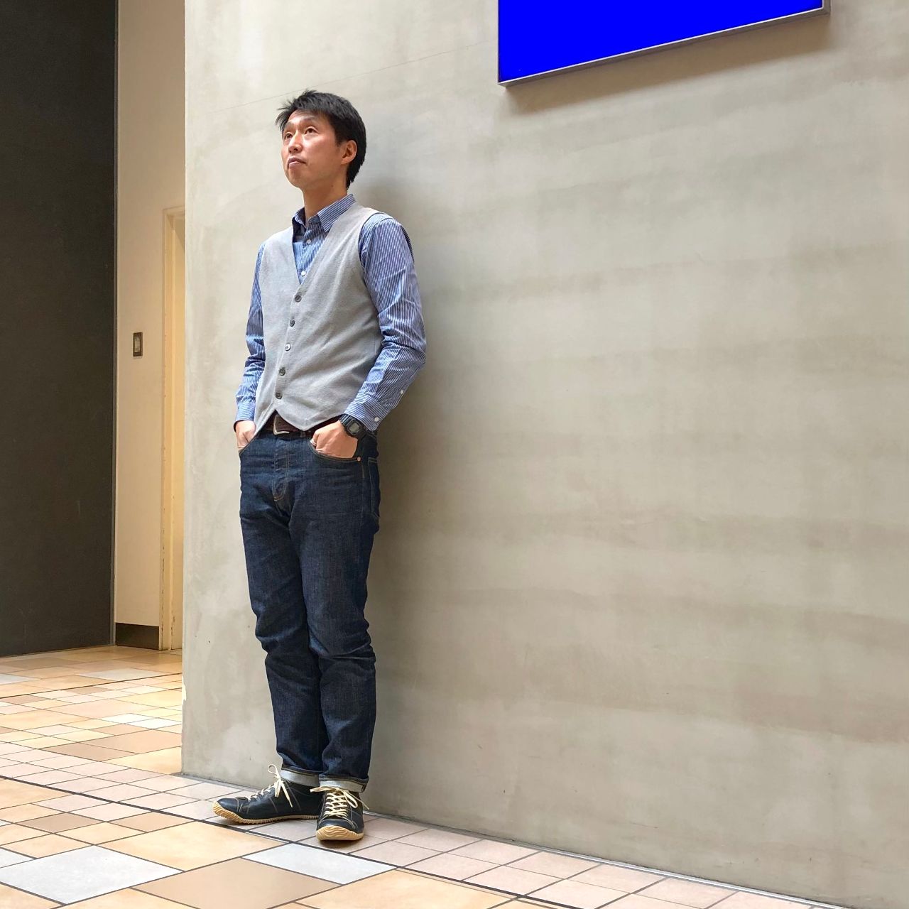 シャツ、デニム、シューズで同系色の異素材コーディネート。