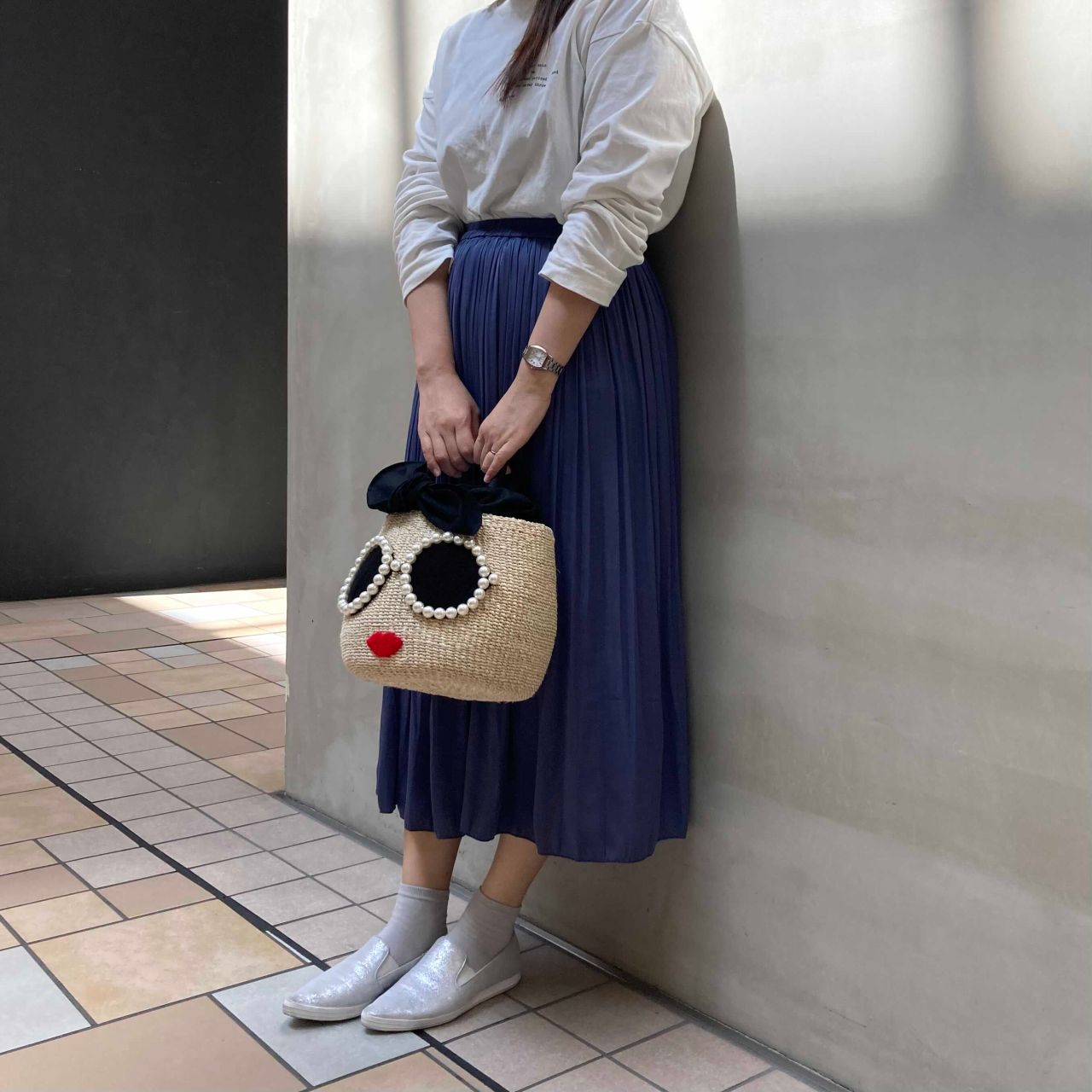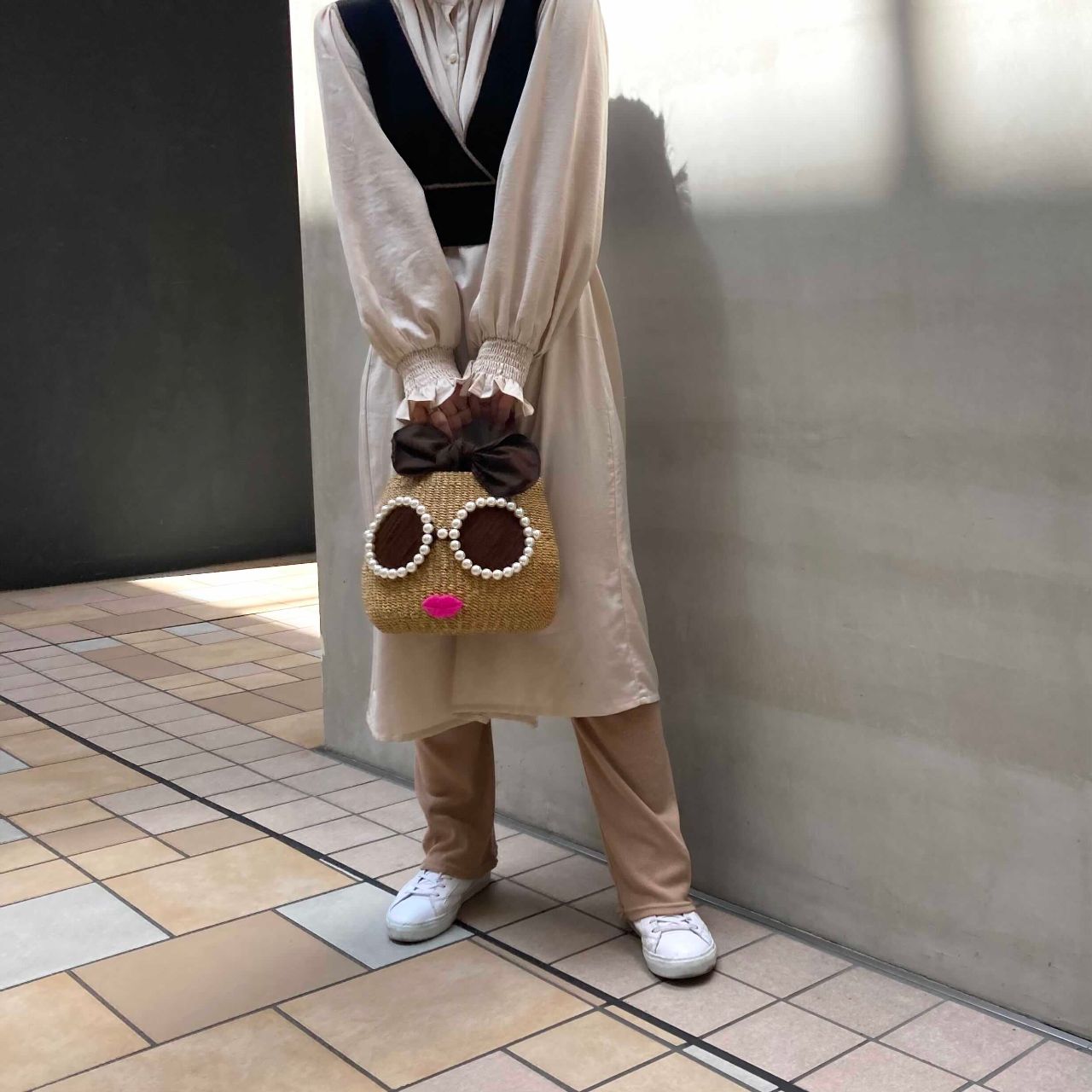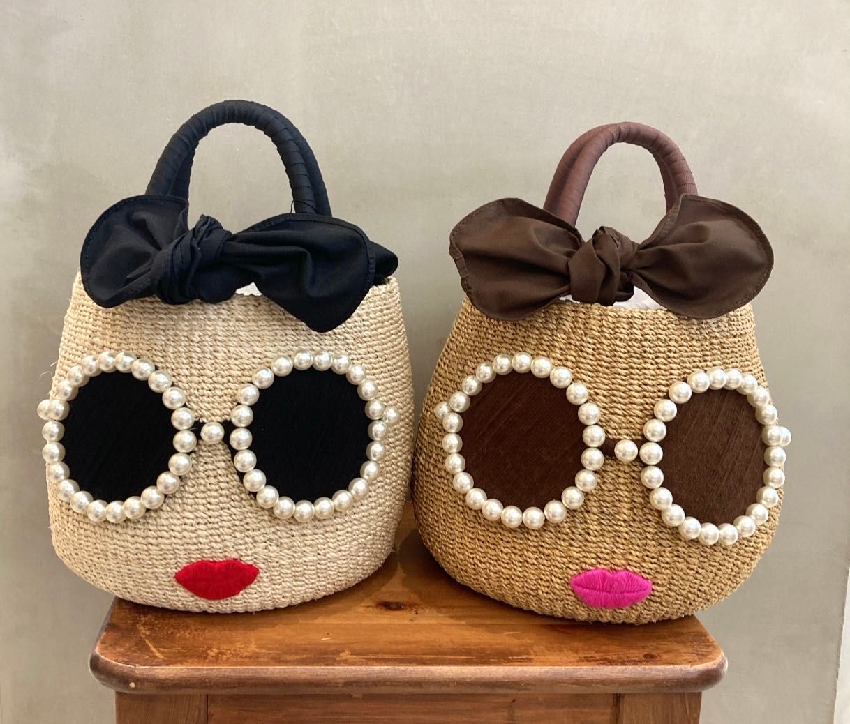 大きなサングラスと鮮やかなリップが特徴的で、ころんとしたフォルムがなんとも可愛らしいかごバッグです!