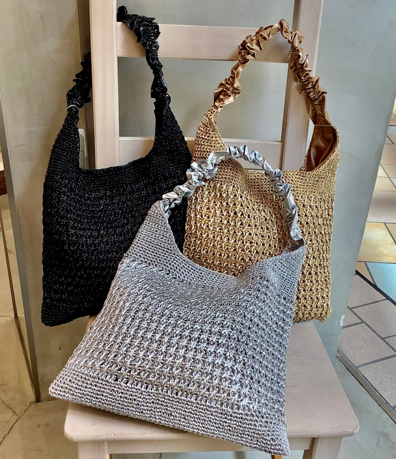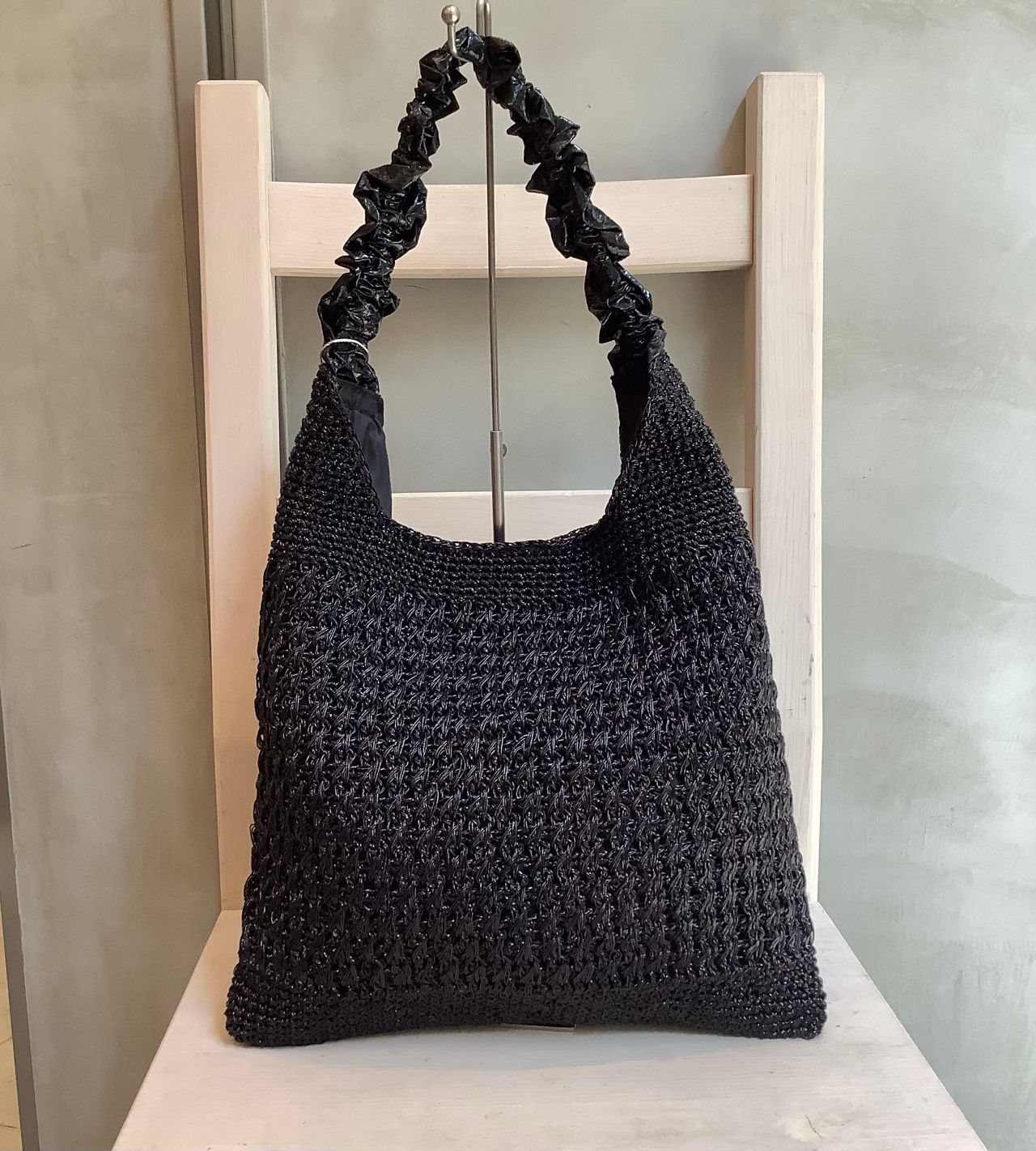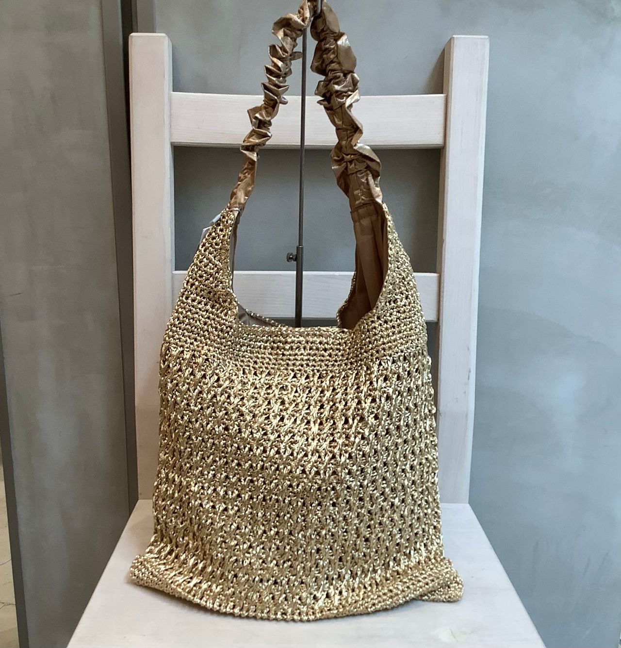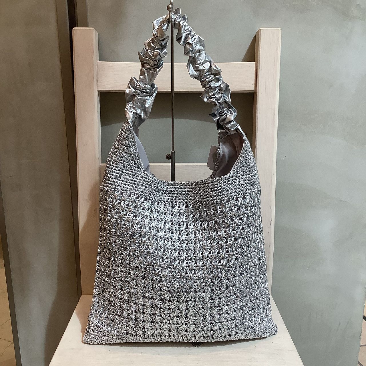 メタリックヤーンを編み込んだワンショルダー。