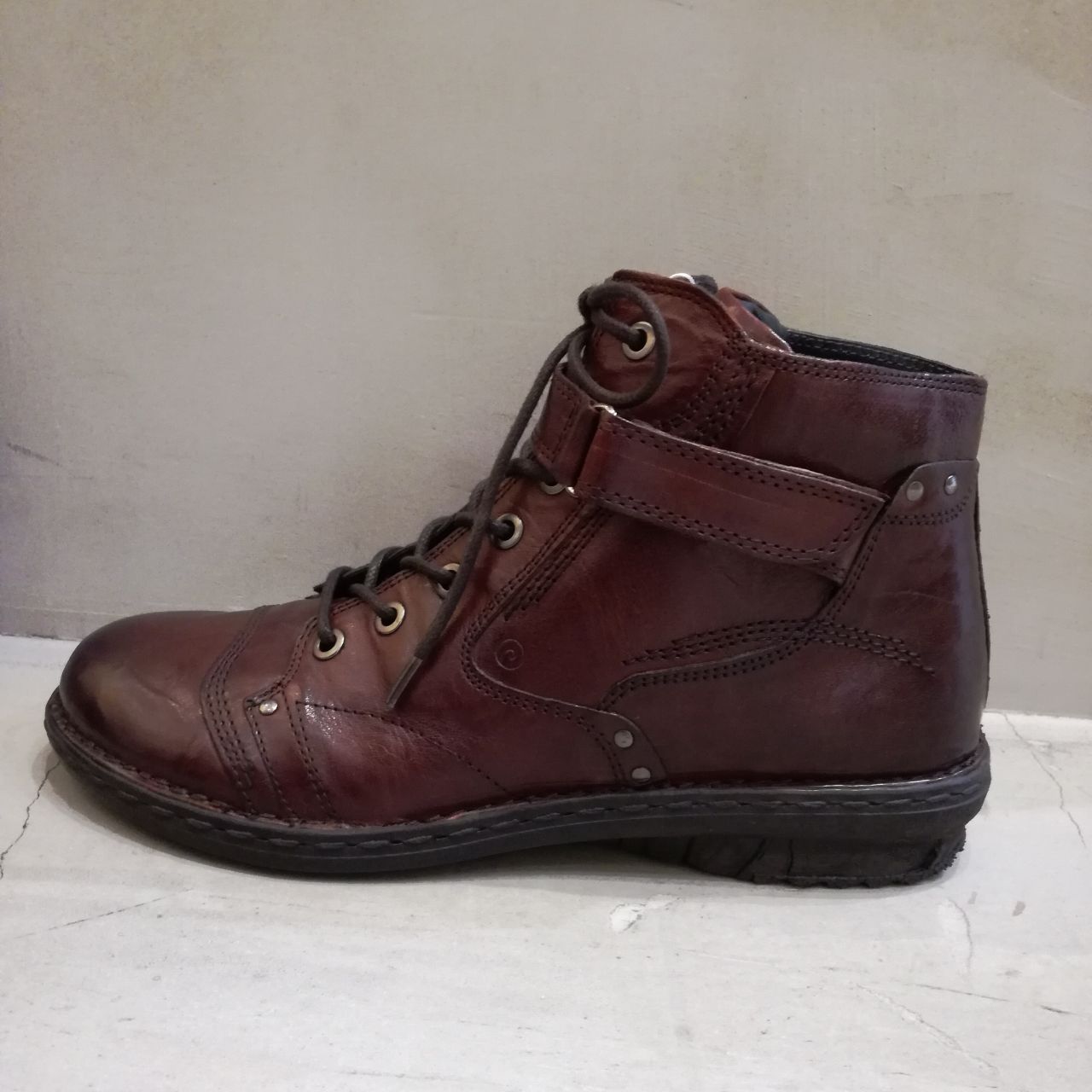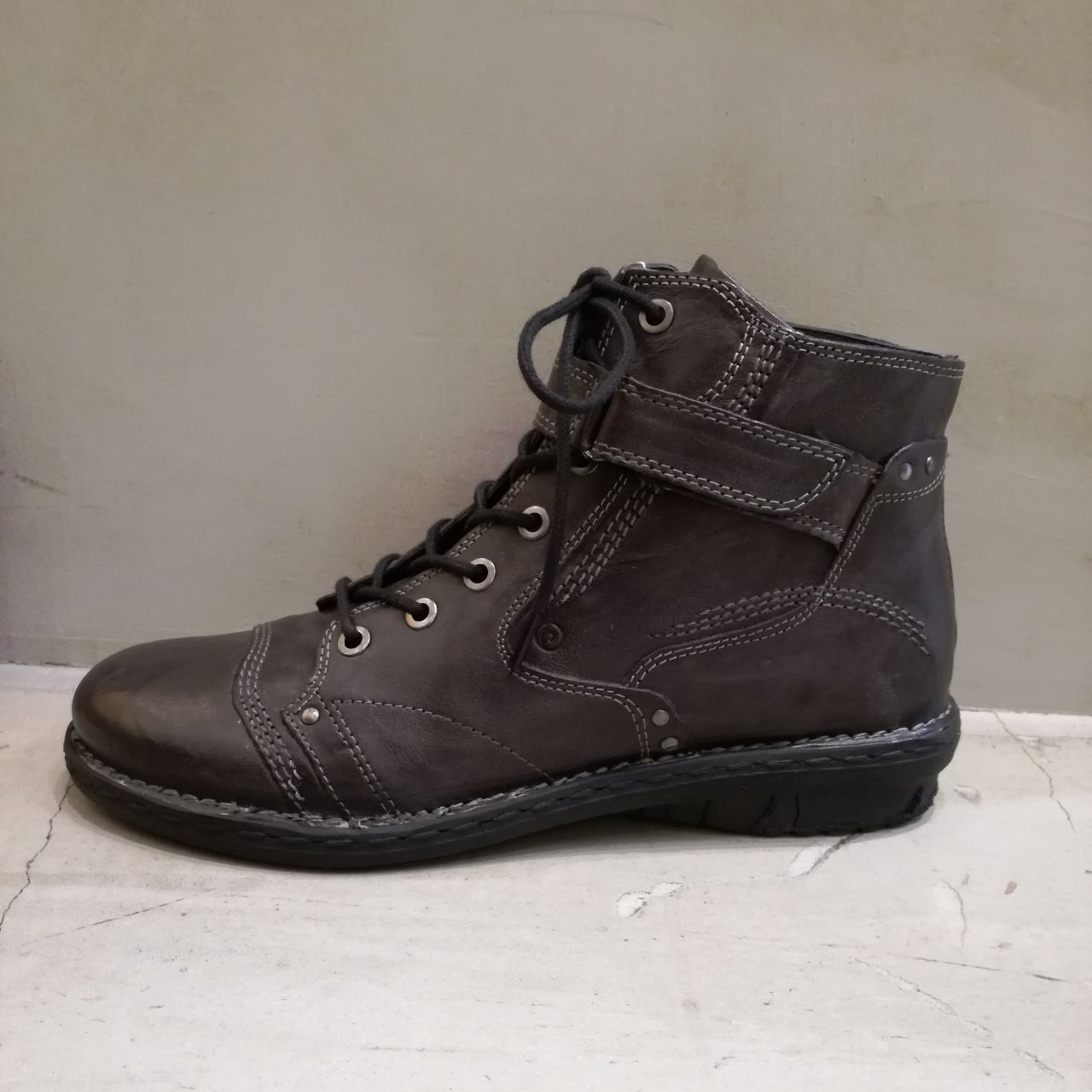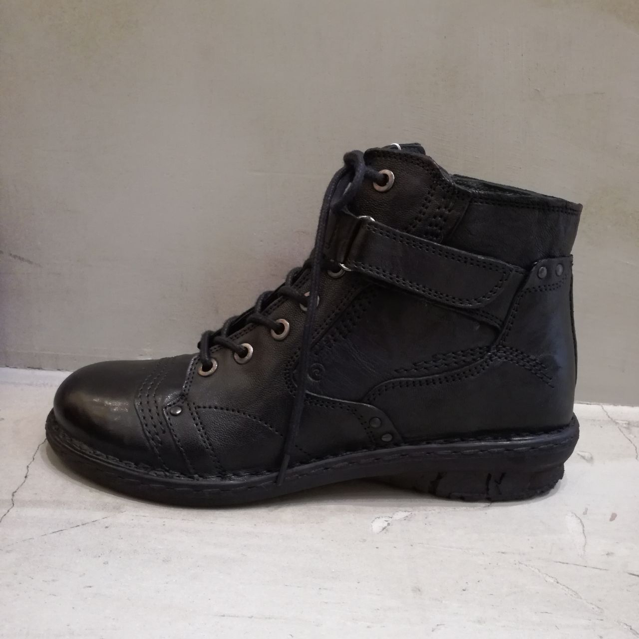 こちらのブーツは、ヴィンテージ感のある革に、ステッチやスタッズ、足首のベルトなどで個性を出した編み上げショートブーツです。