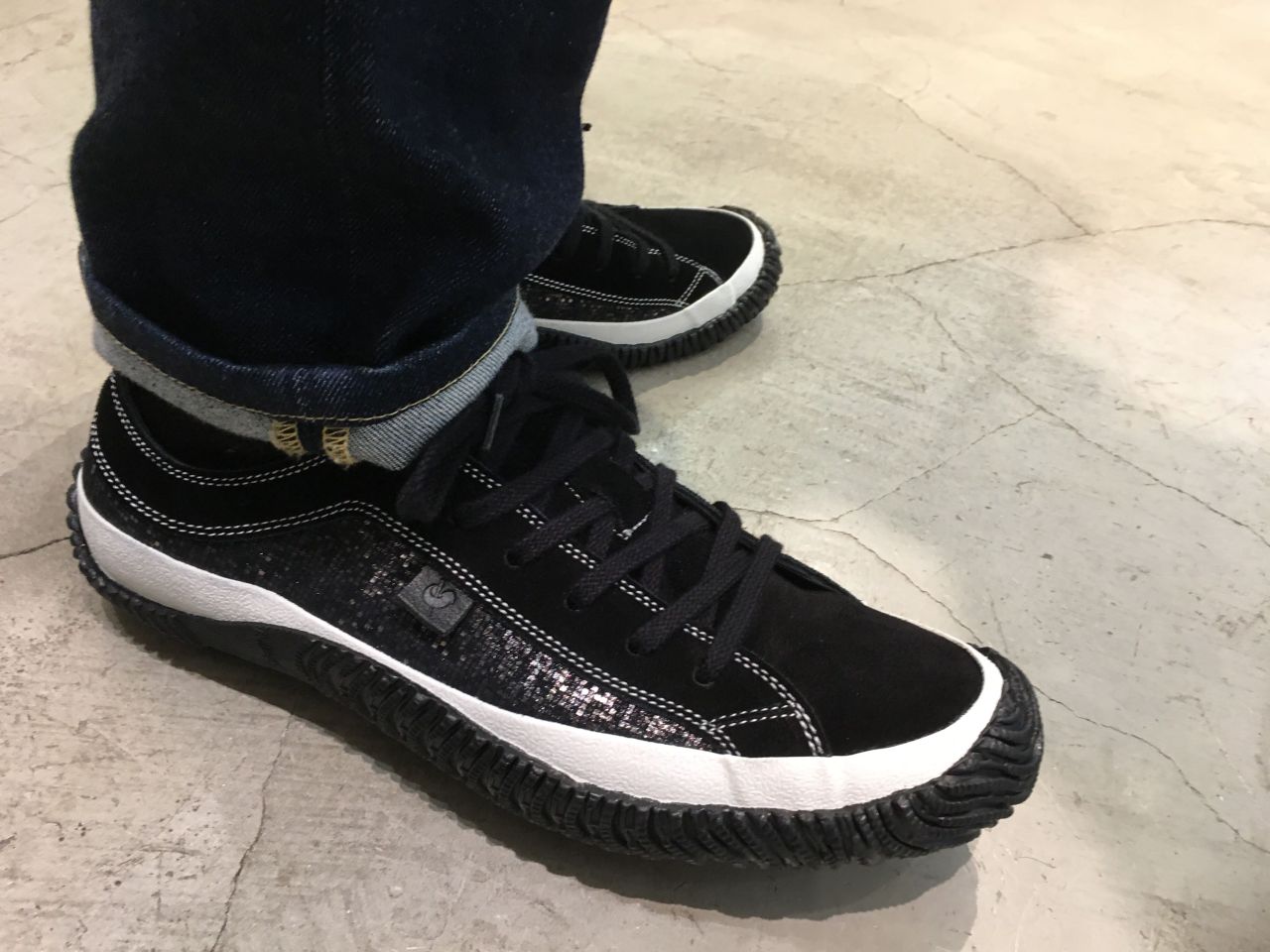 ブラックのスニーカーでありながらホワイトのフォクシングテープがアクセントで効いています。