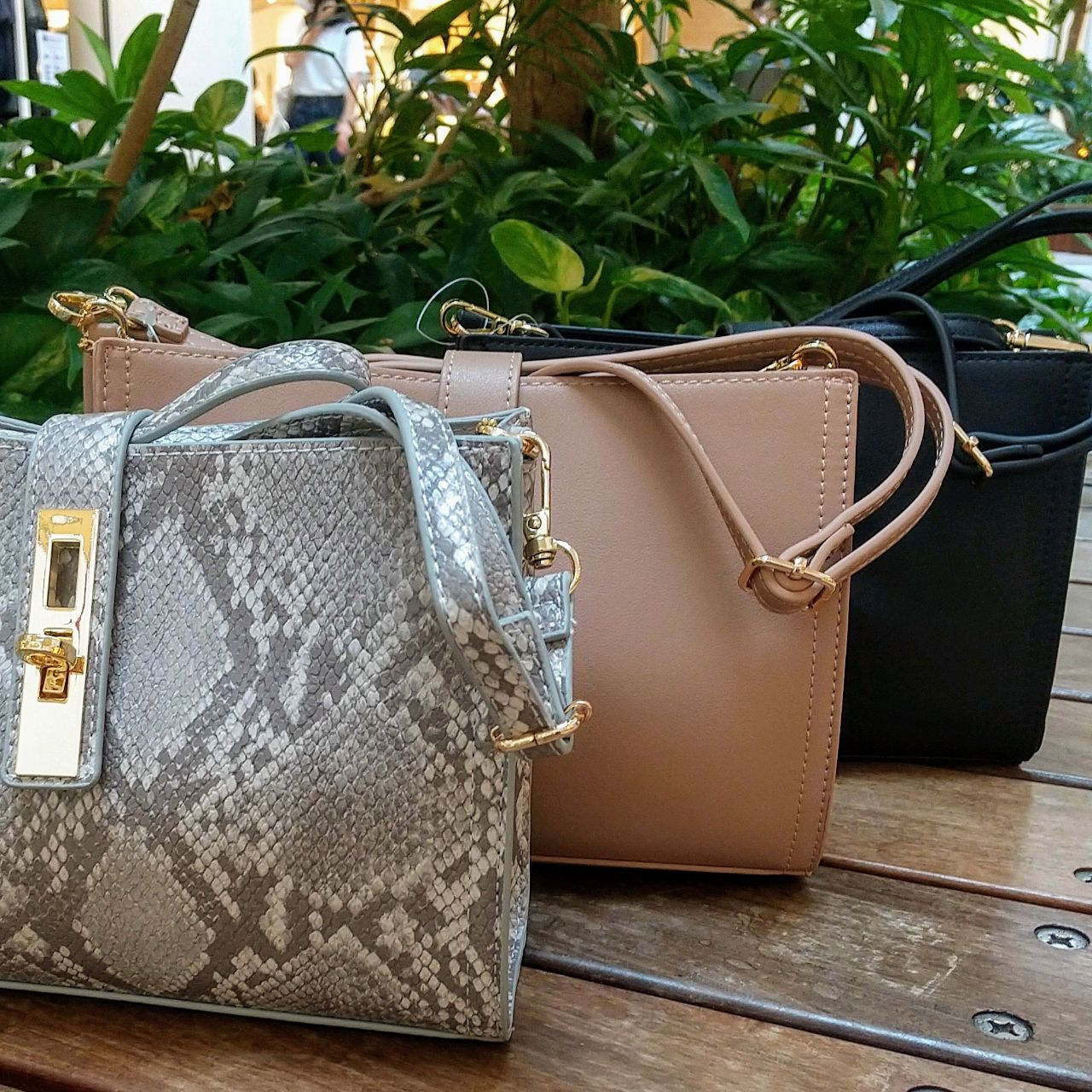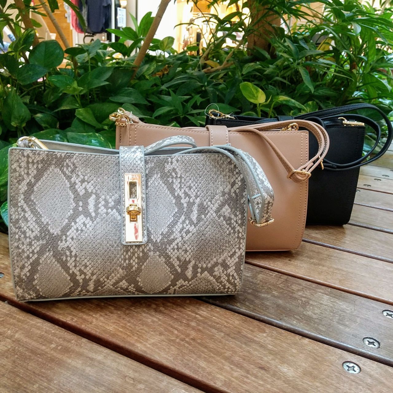 カラーは、合わせやすいオークとブラック。人気のパイソン柄の3色です。