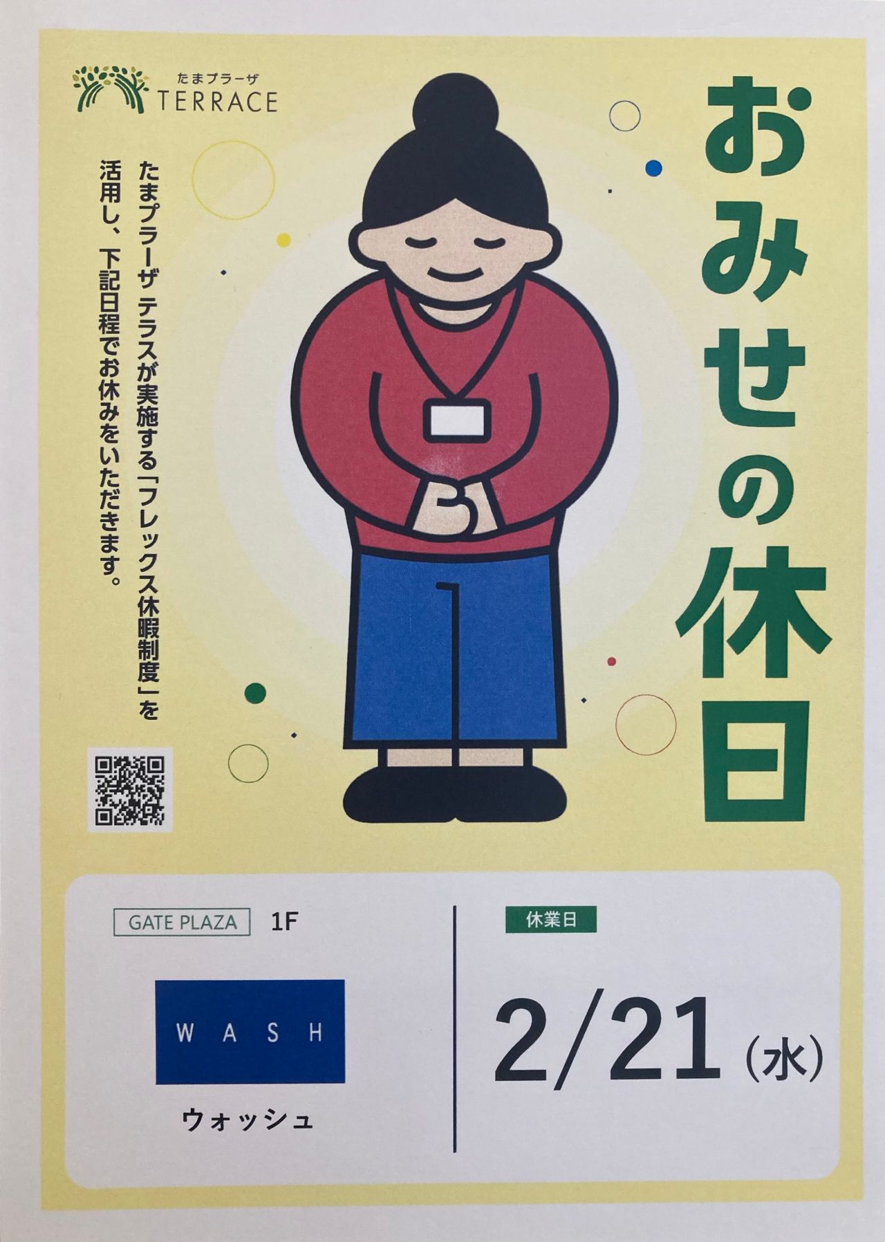 2月21日はWASHたまプラーザテラス店はお休みとなります。