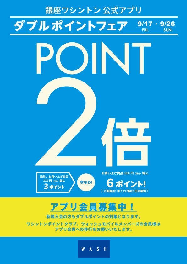 『銀座ワシントン公式アプリ』ではWASH・Essay・銀座ワシントン各店とオンラインショップ共通でポイントをご利用いただけます。