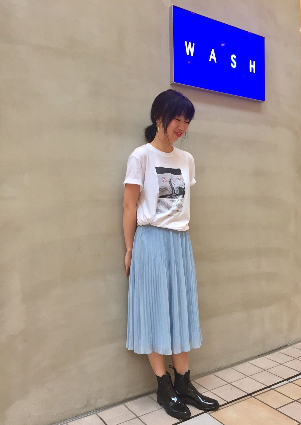 スカート、Tシャツのカジュアルスタイルも