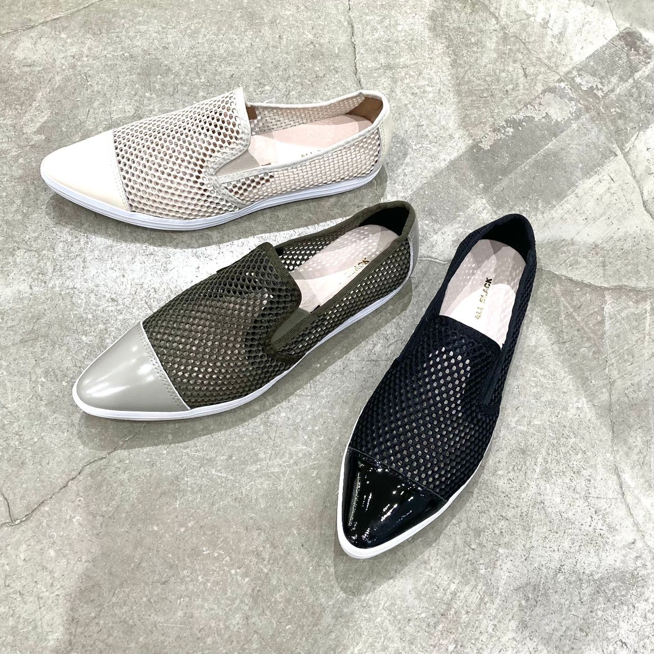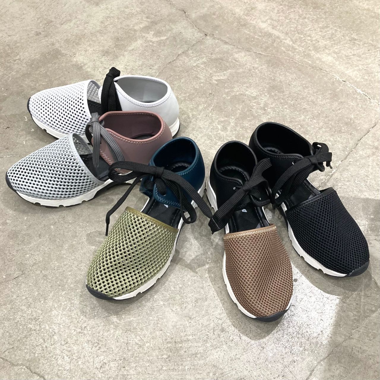 カラー:(左から) WHITE , GY/PU , GR/NV , TA/BL , BLK