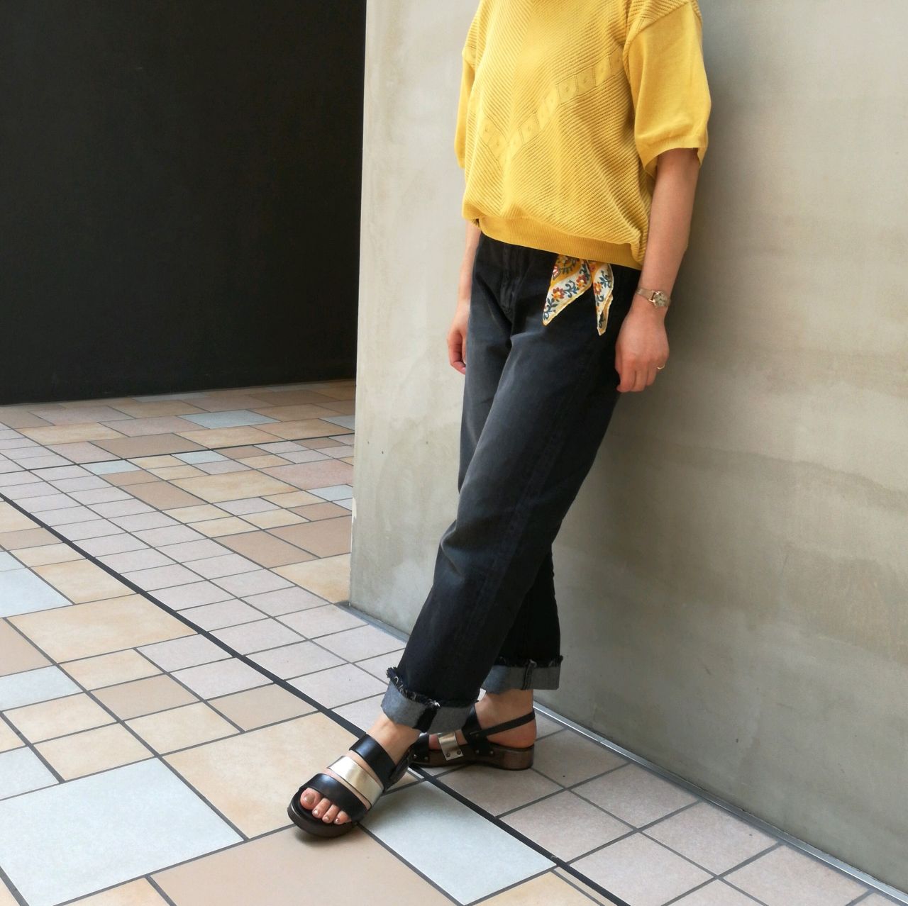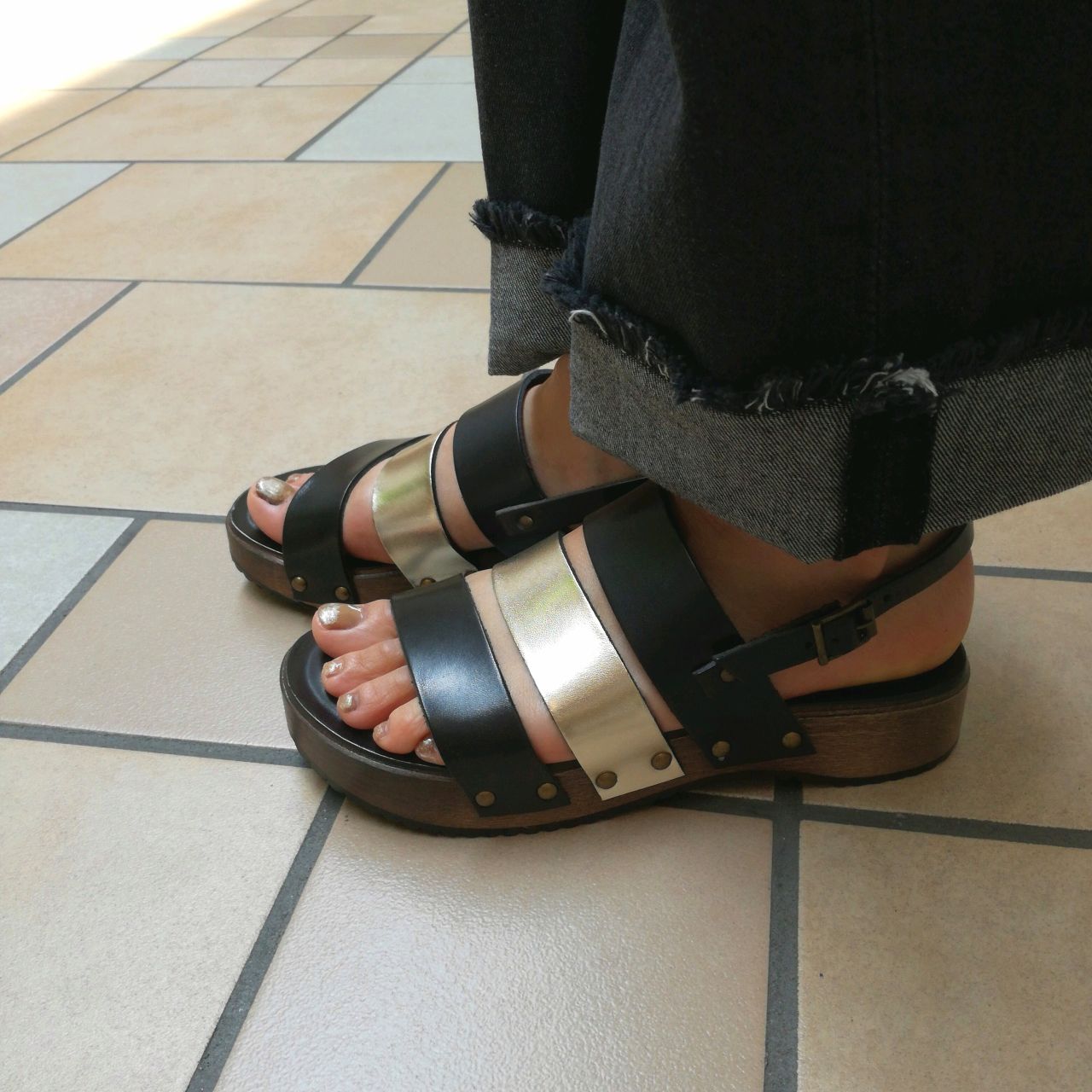厚底のウッドソールに鋲という、ハードになりそうな組み合わせも[CORSO ROMA]だと上品になりますね。