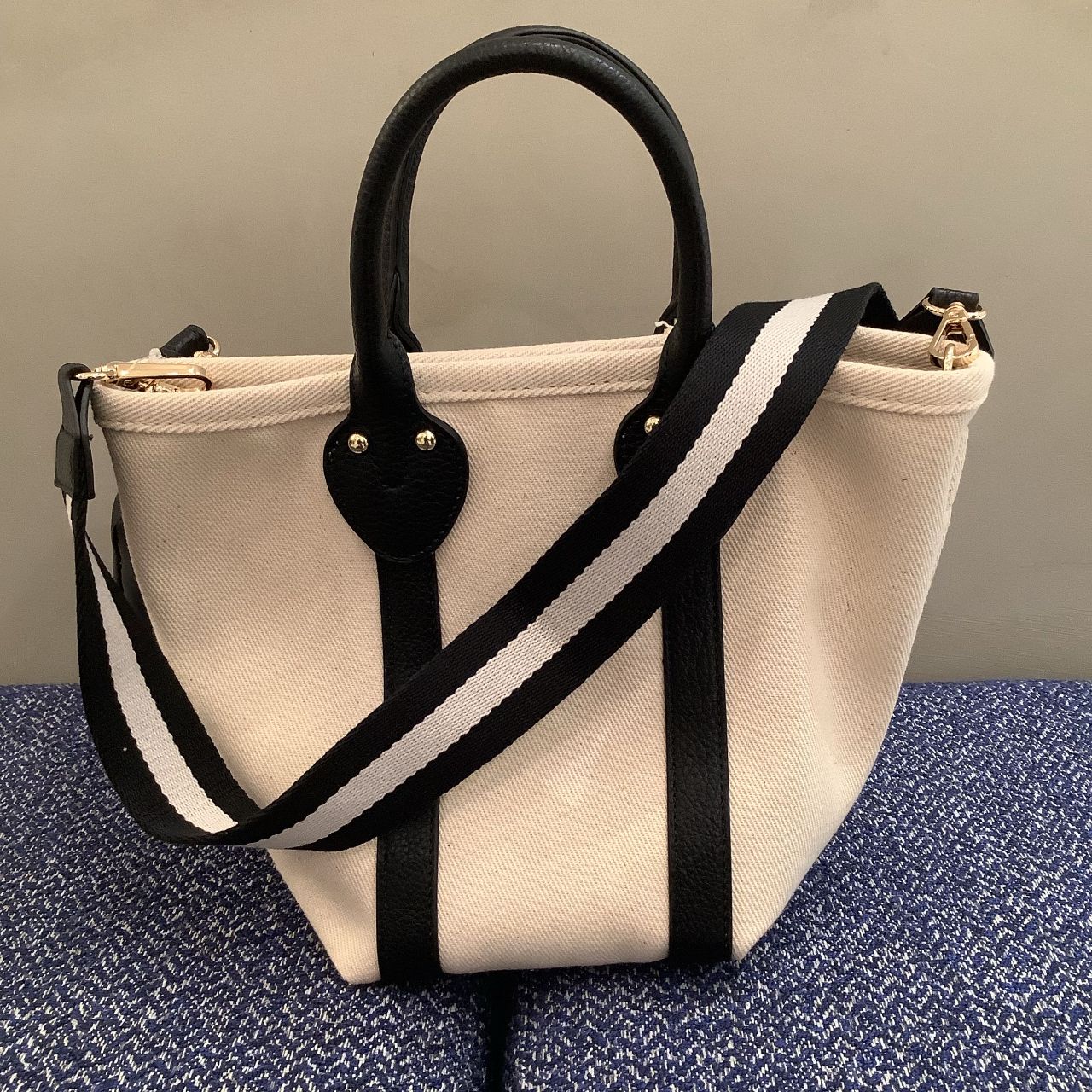 高級感のあるシボの合成皮革ハンドルのキャンバスショルダーバッグ。