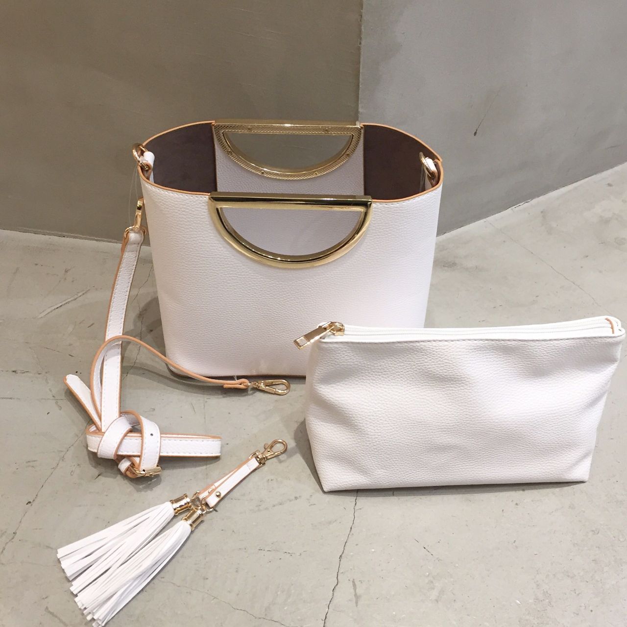 付属のショルダー、チャーム、ポーチは取外し可能です。