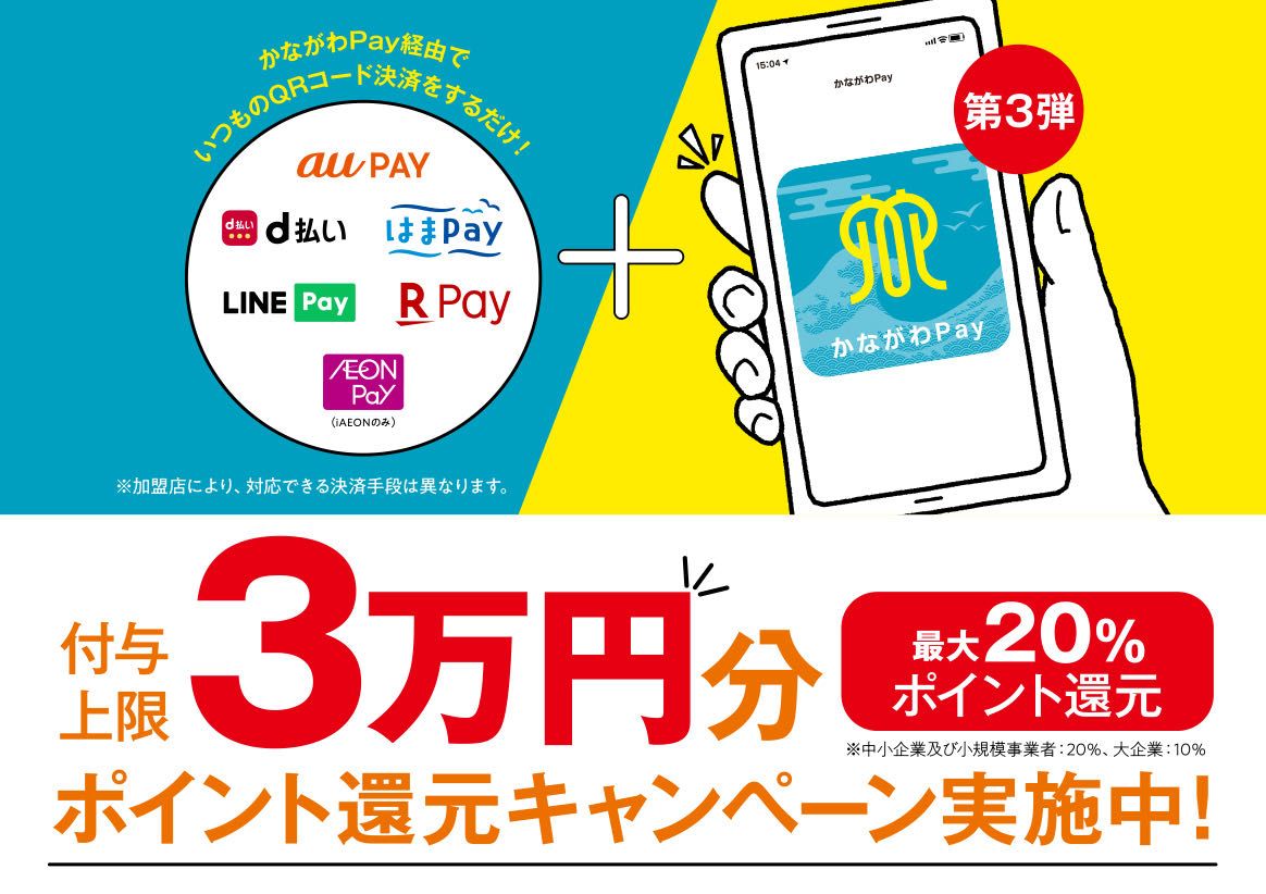 かながわpay第三弾では、20%のポイント還元(付与上限3万円分)です!