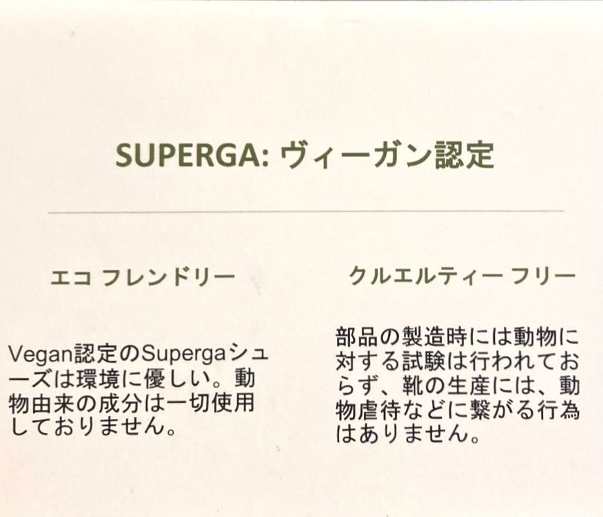 ちなみにSUPERGAは、環境や配慮したエコなスニーカーとして、ヴィーガン認定されております。