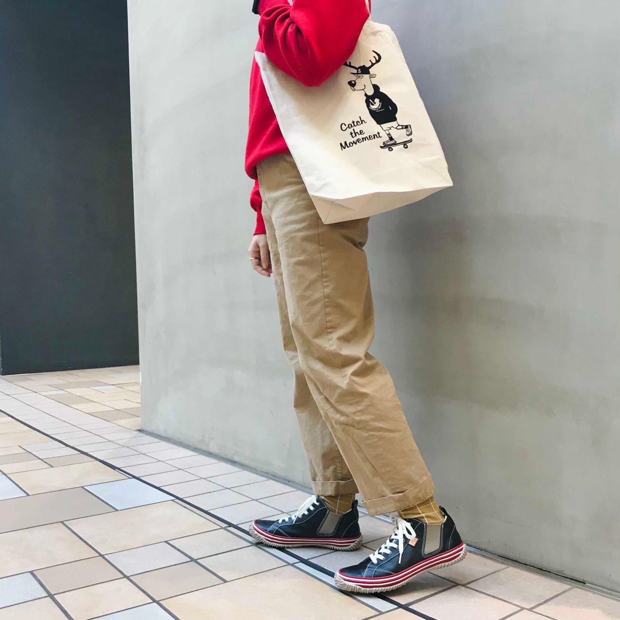 スニーカーのカラーリングに合わせてコーディネート。