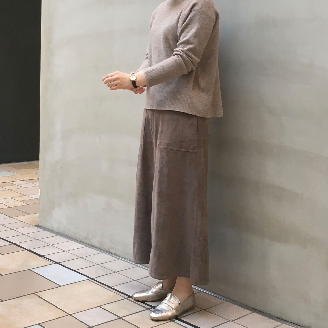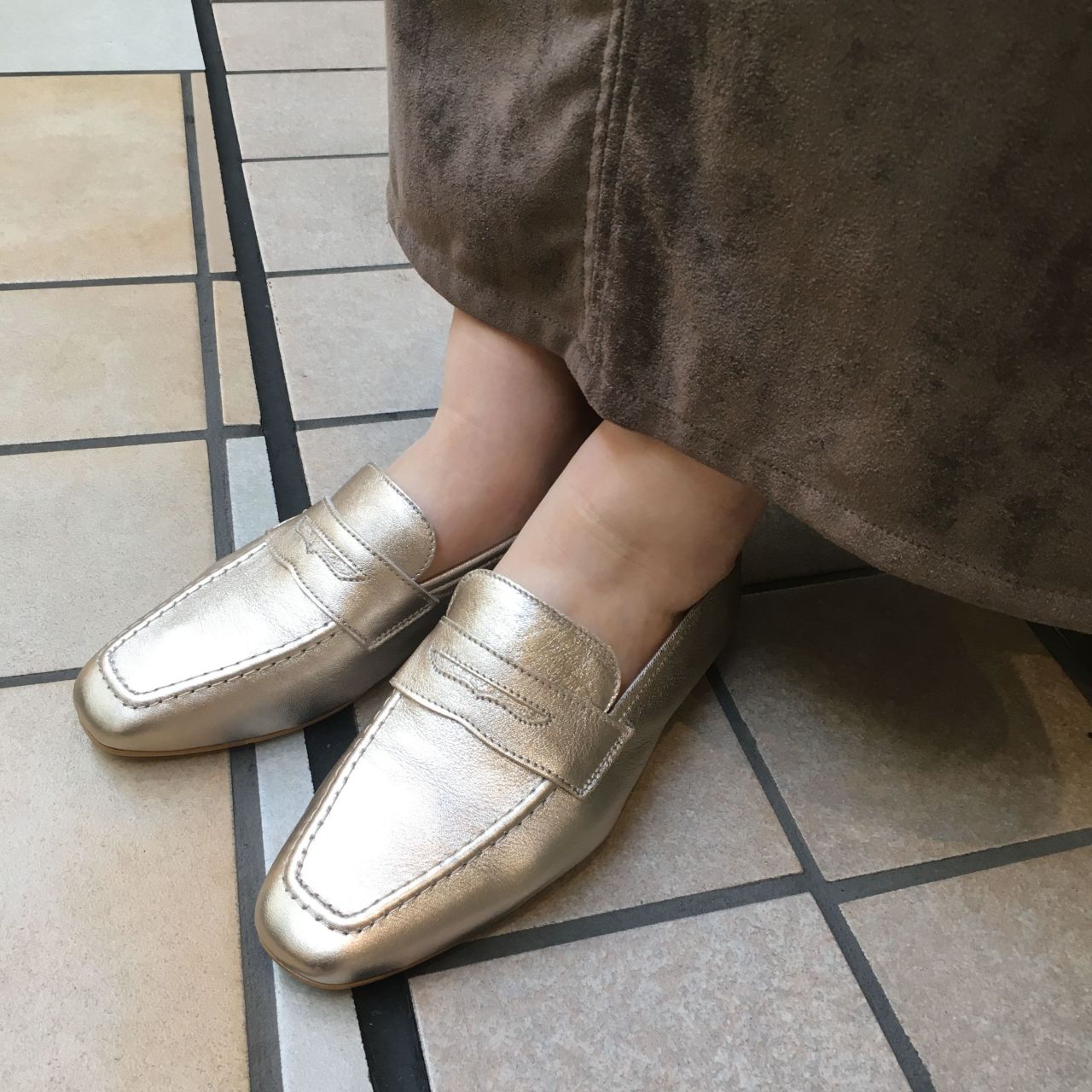 ブラウンのワントーンコーデも足元が同系色のメタリックになるだけで雰囲気がガラッと変わります。