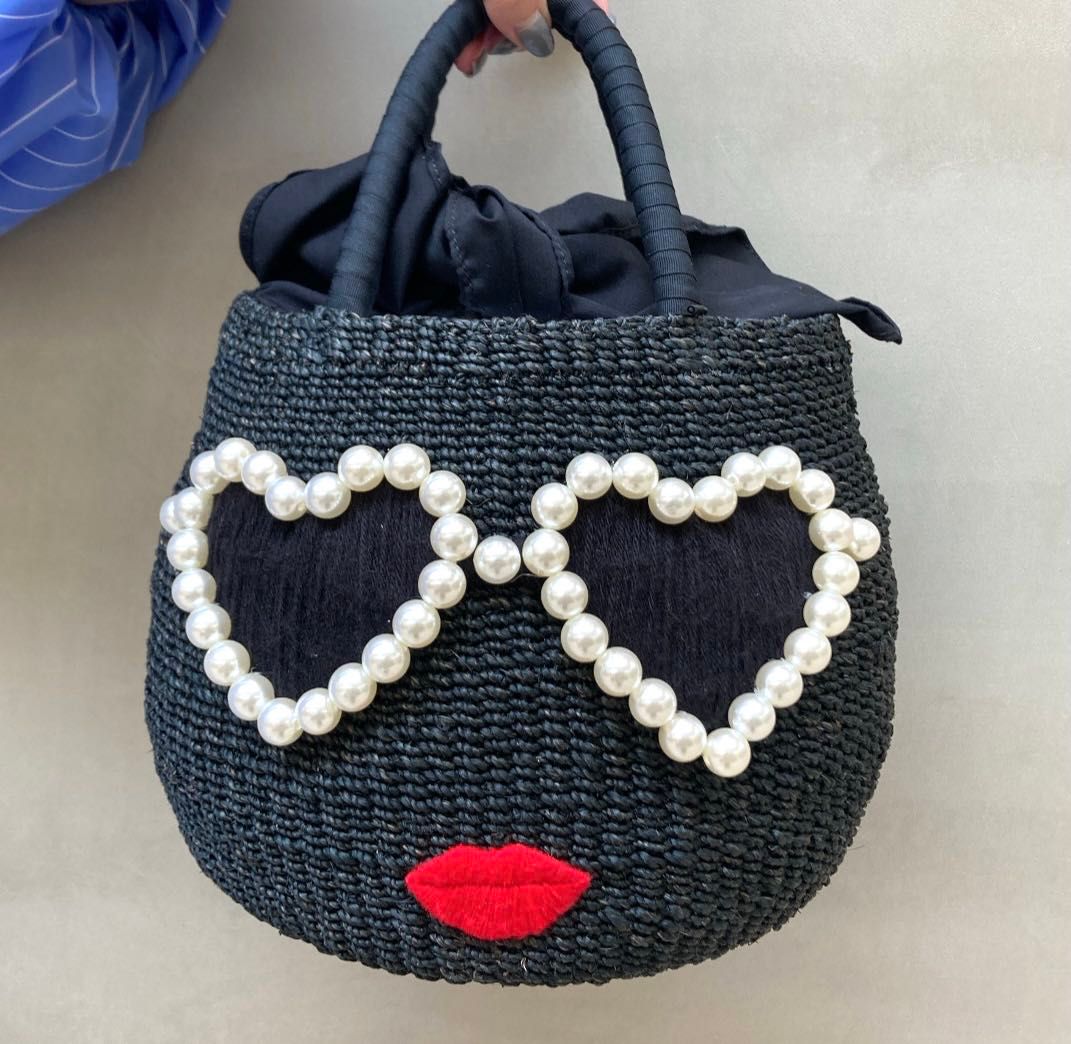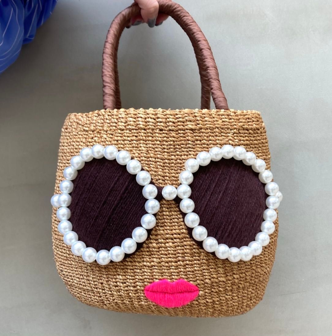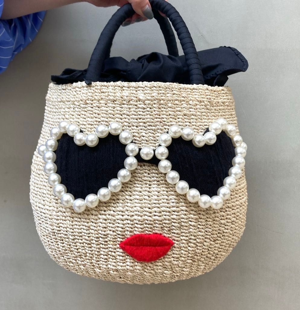 パールのサングラスとぷっくり唇が存在感大のカゴBAGで、天然麻素材を使用したハンドメイドです!