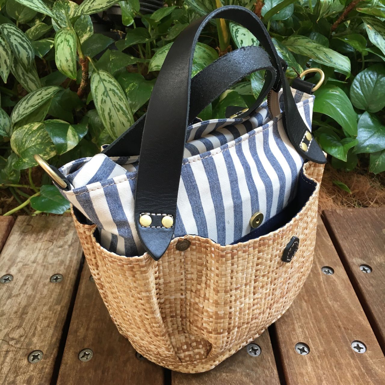 ジッパー部分の布地を中に折りこむと、持ち手を長くお持ち頂ける仕様に変身します!!