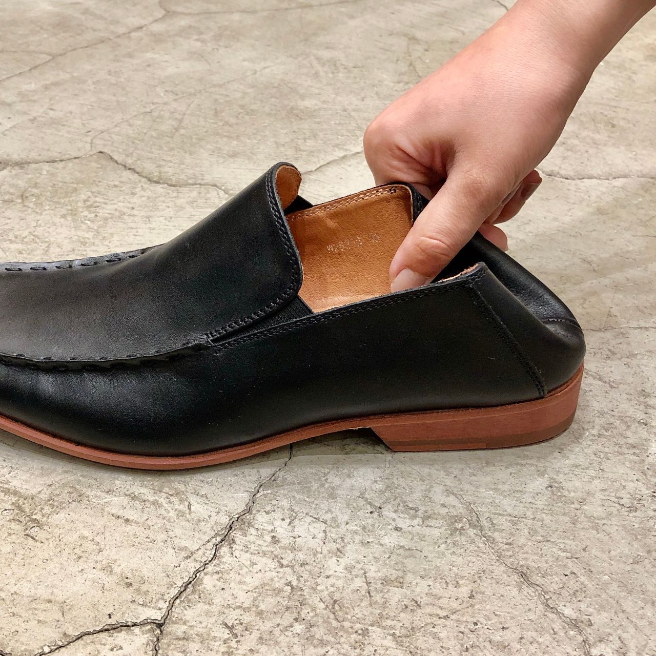 「クラッシュバンプ」とも呼ばれる踵の芯を抜いた仕上がりになっています。