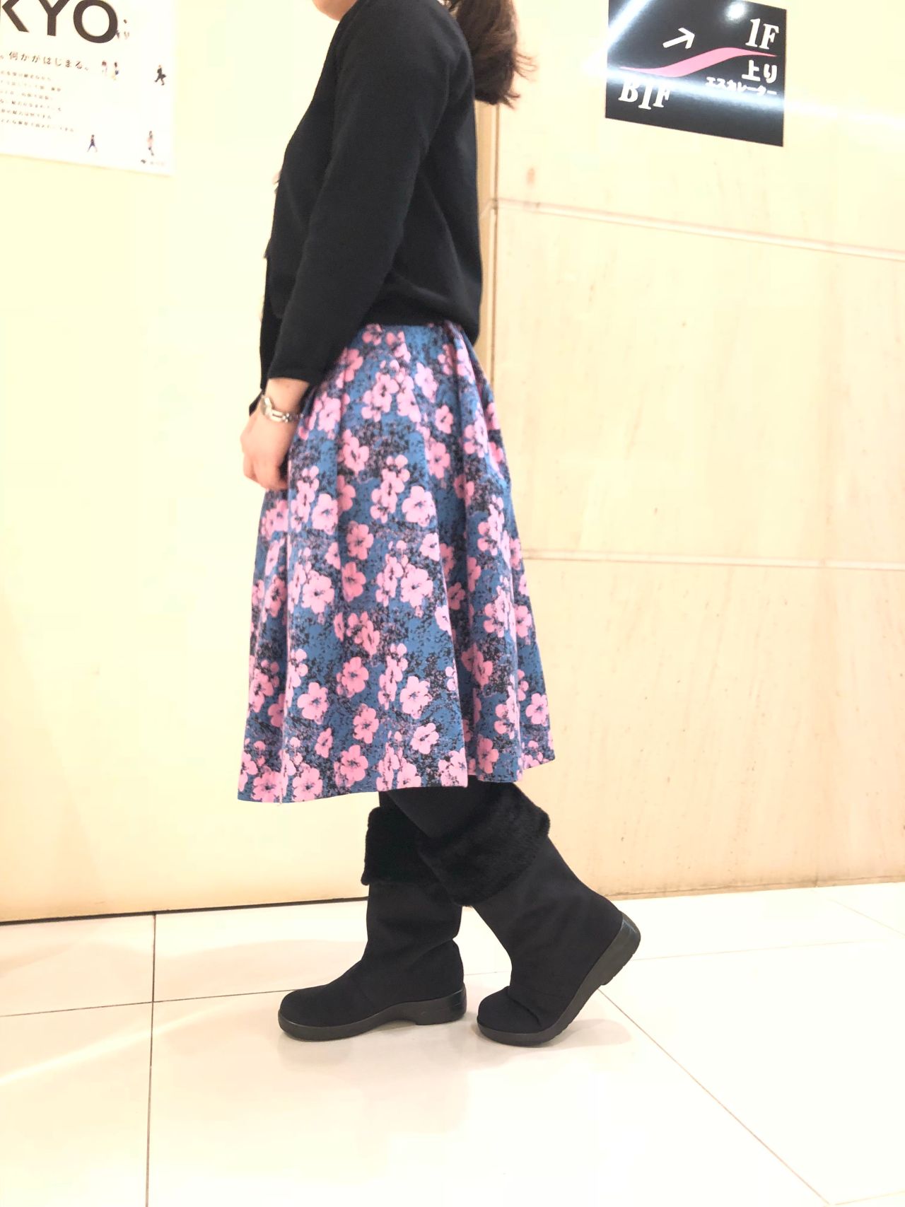 ブラックですと柄物スカートでも甘くなり過ぎないコーディネートに。