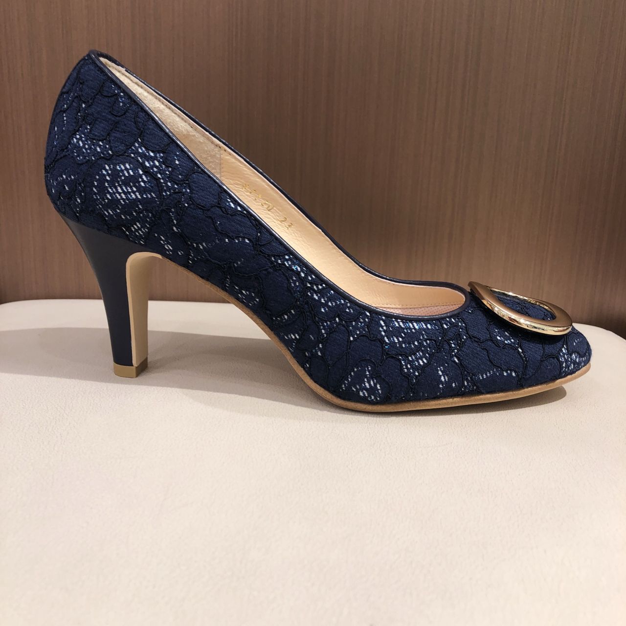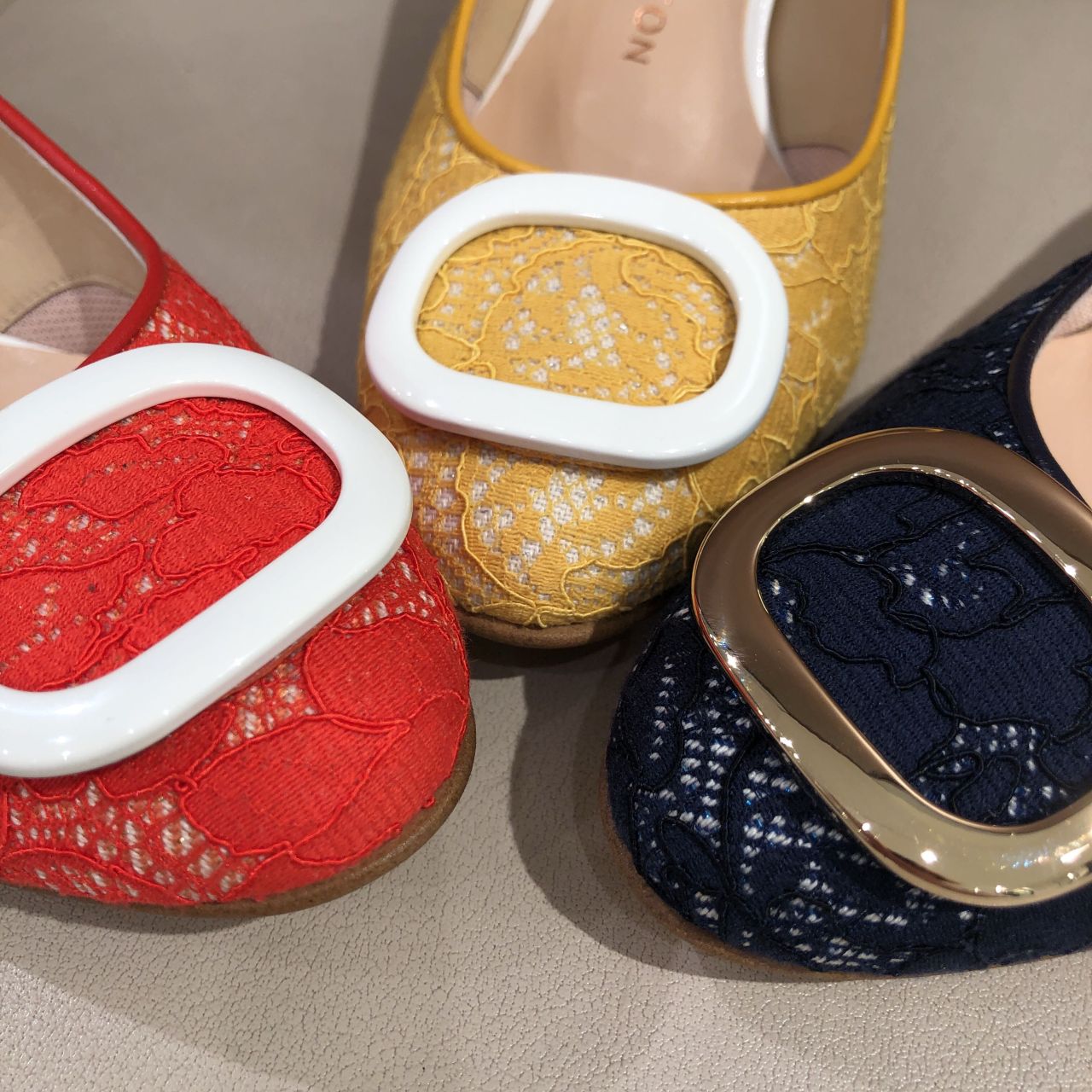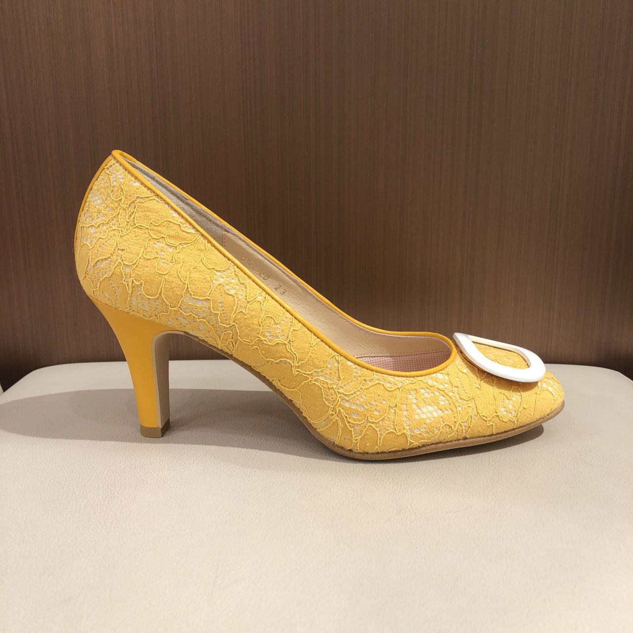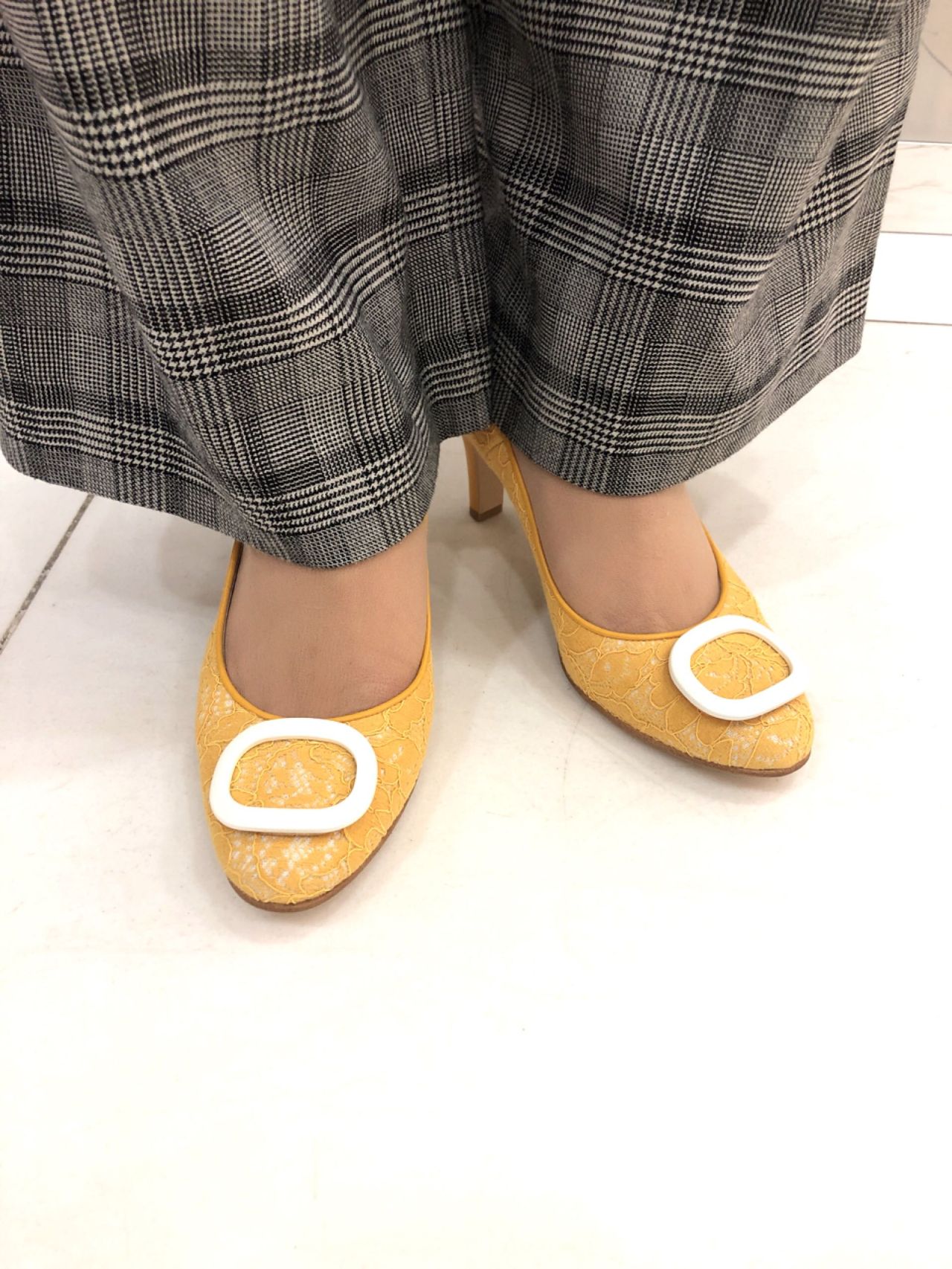 レースがフェミニンな印象のネイビー、オレンジ、イエロー。