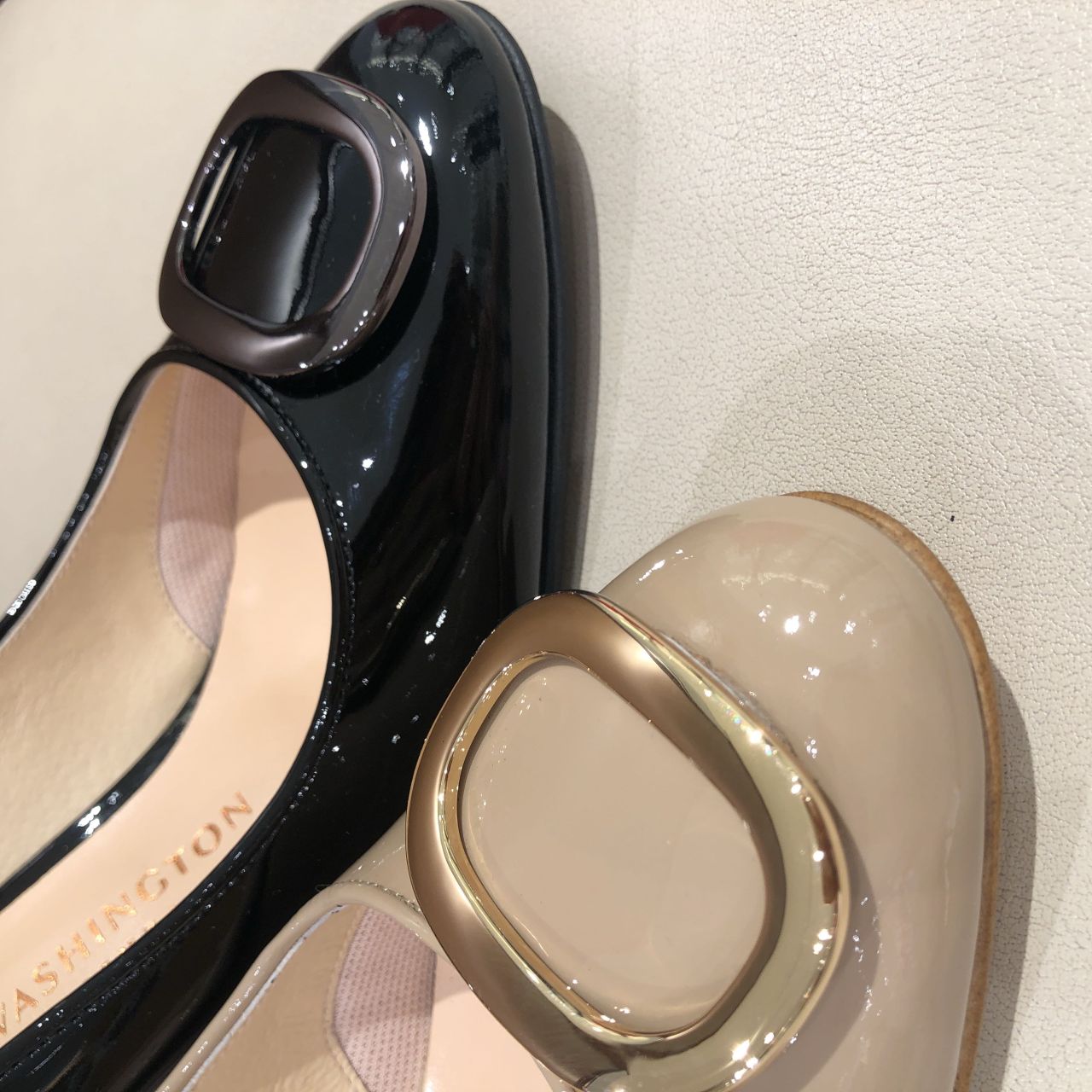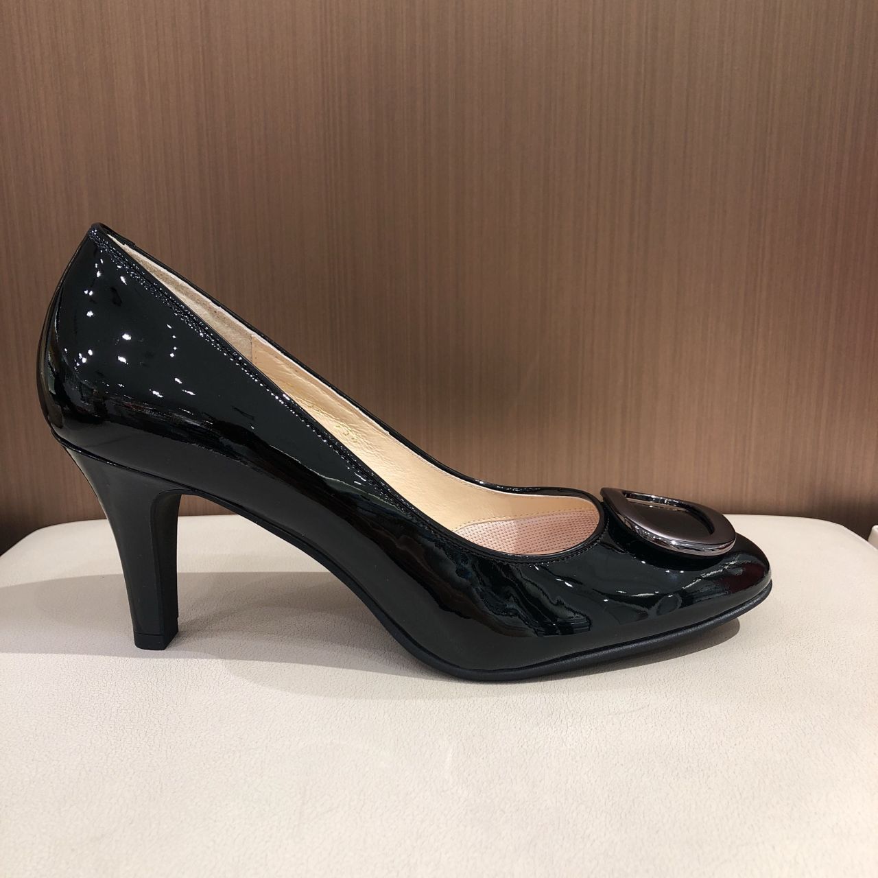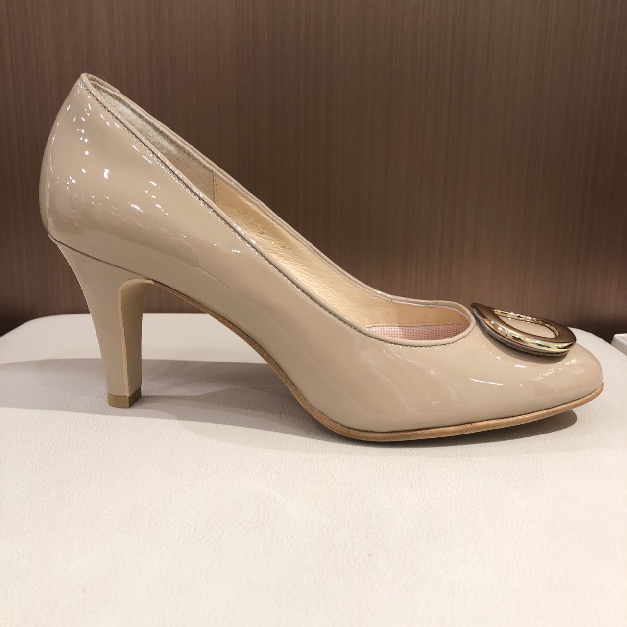 ツヤ感とメタリックなバックルが華やかなベージュ、ブラックです。