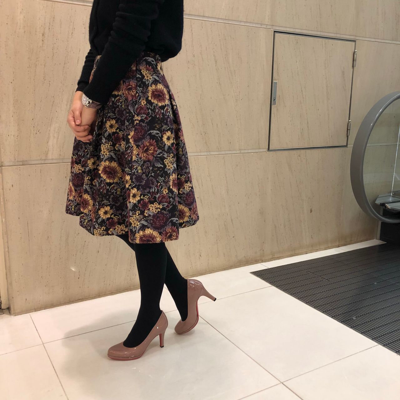 スカートスタイルには鉄板のコーディネート♪ ピンクベージュは明る過ぎないカラーなので黒タイツでも浮きません!