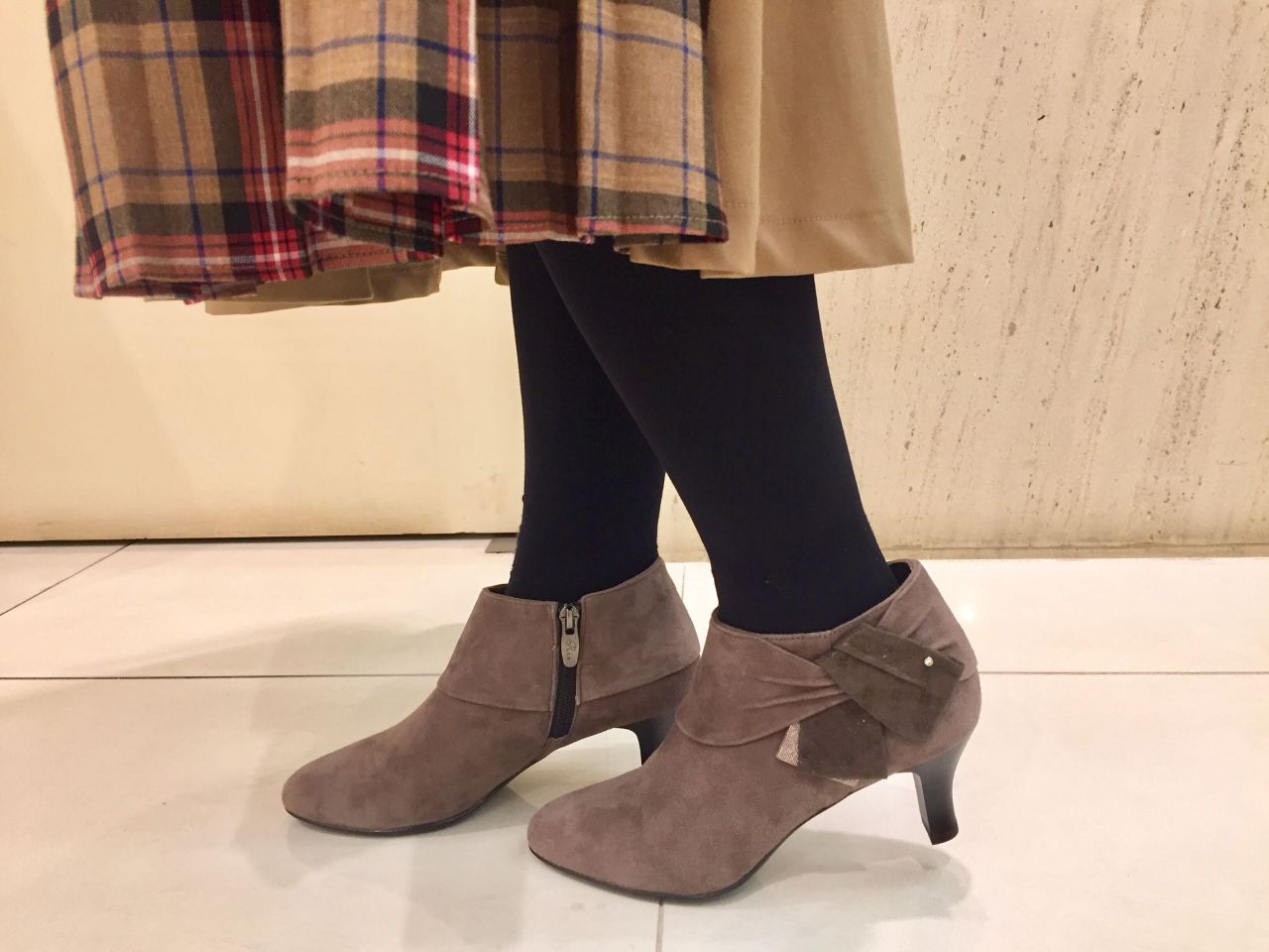 グレージュ系のお色味ですので黒タイツと合わせた時でも浮かずに履いて頂けます◯