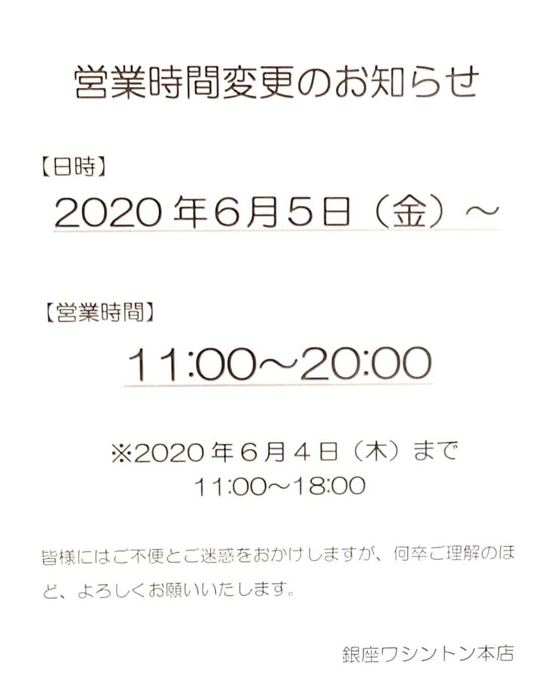 6月5日より、ワシントン銀座本店は営業時間変更となります。