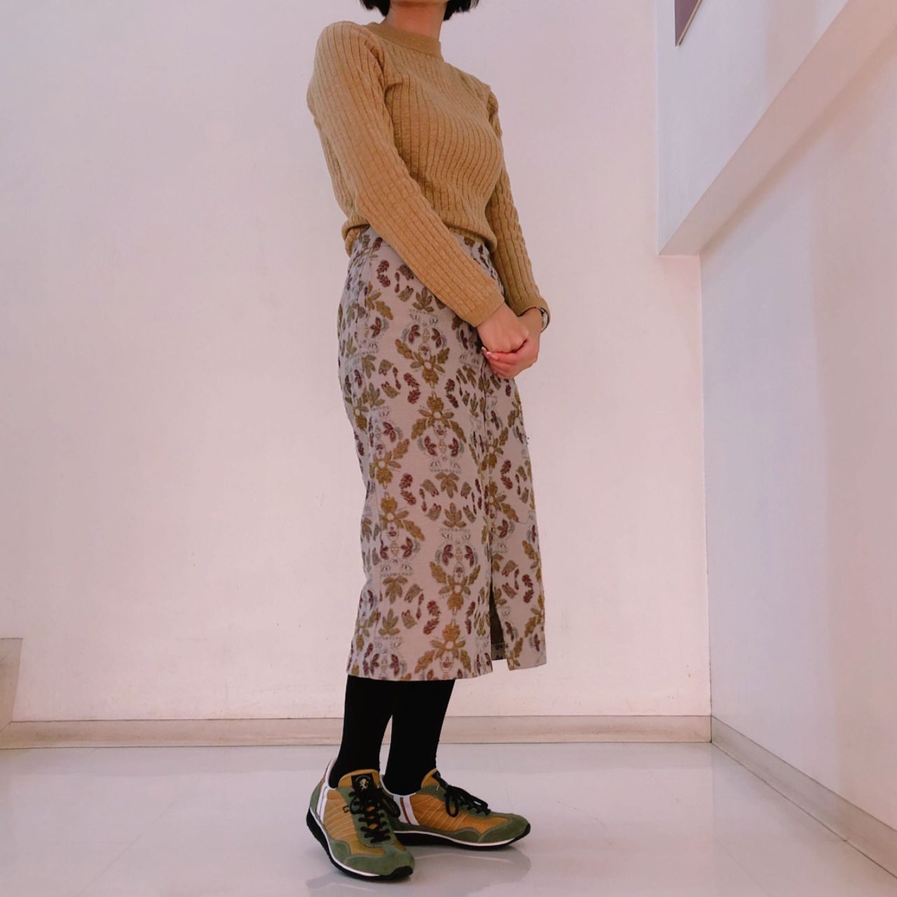 スッキリしたシルエットなので、色を合わせれば巻きスカートの外しにも。