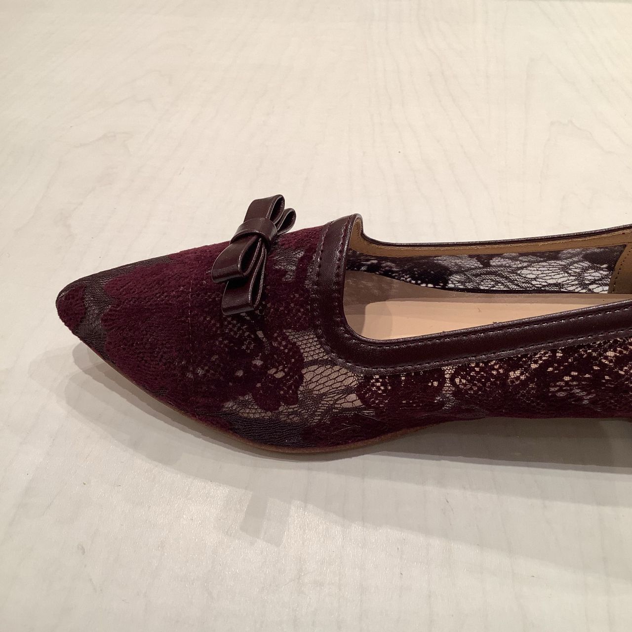 チュール素材をメインに使用した秋らしさかつエレガントさを兼ね備えたフラットシューズ。