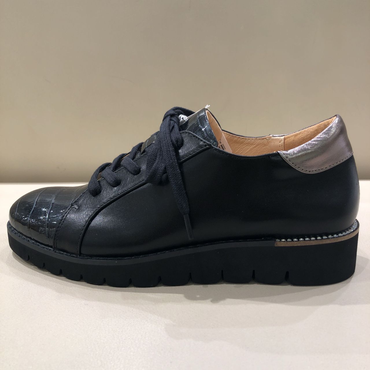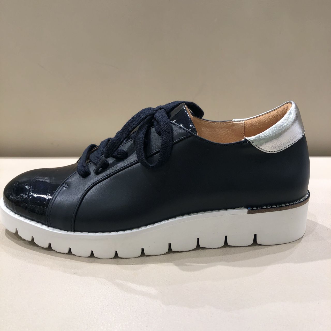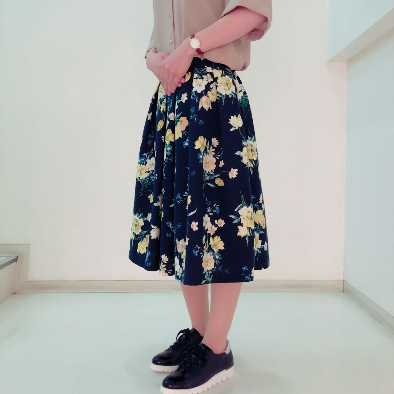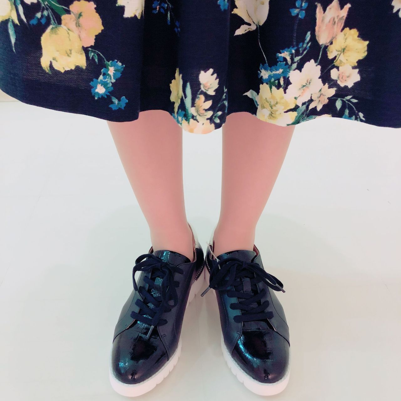 型押しネイビーだと、フェミニンな花柄スカートとも相性良く馴染みます。