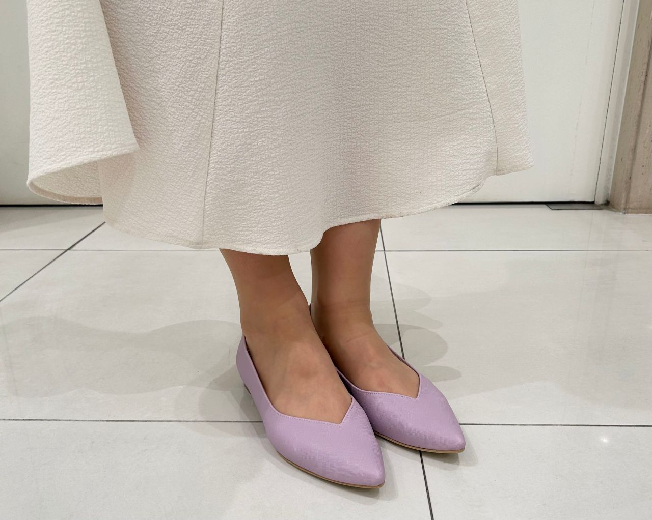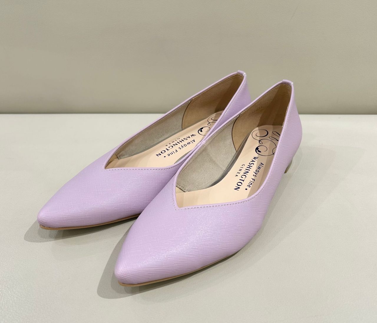 Vカットとポインテッドトゥで、ローヒールでも大人っぽい雰囲気になる人気の晴雨兼用フラットパンプス。