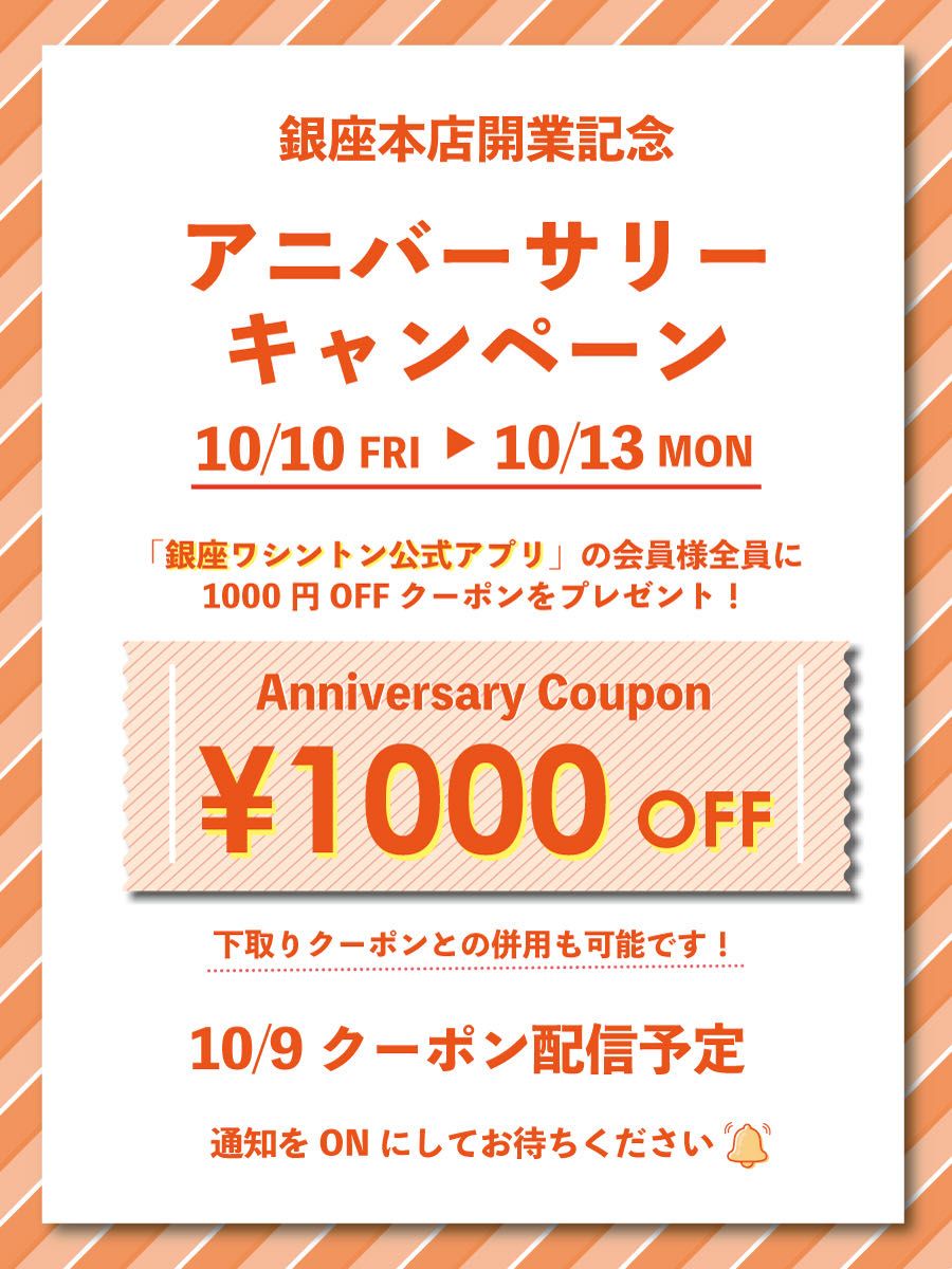 銀座本店開業記念として、期間中1回、アプリ会員様限定でご利用いただける1000円オフのアニバーサリークーポンを配信いたします!