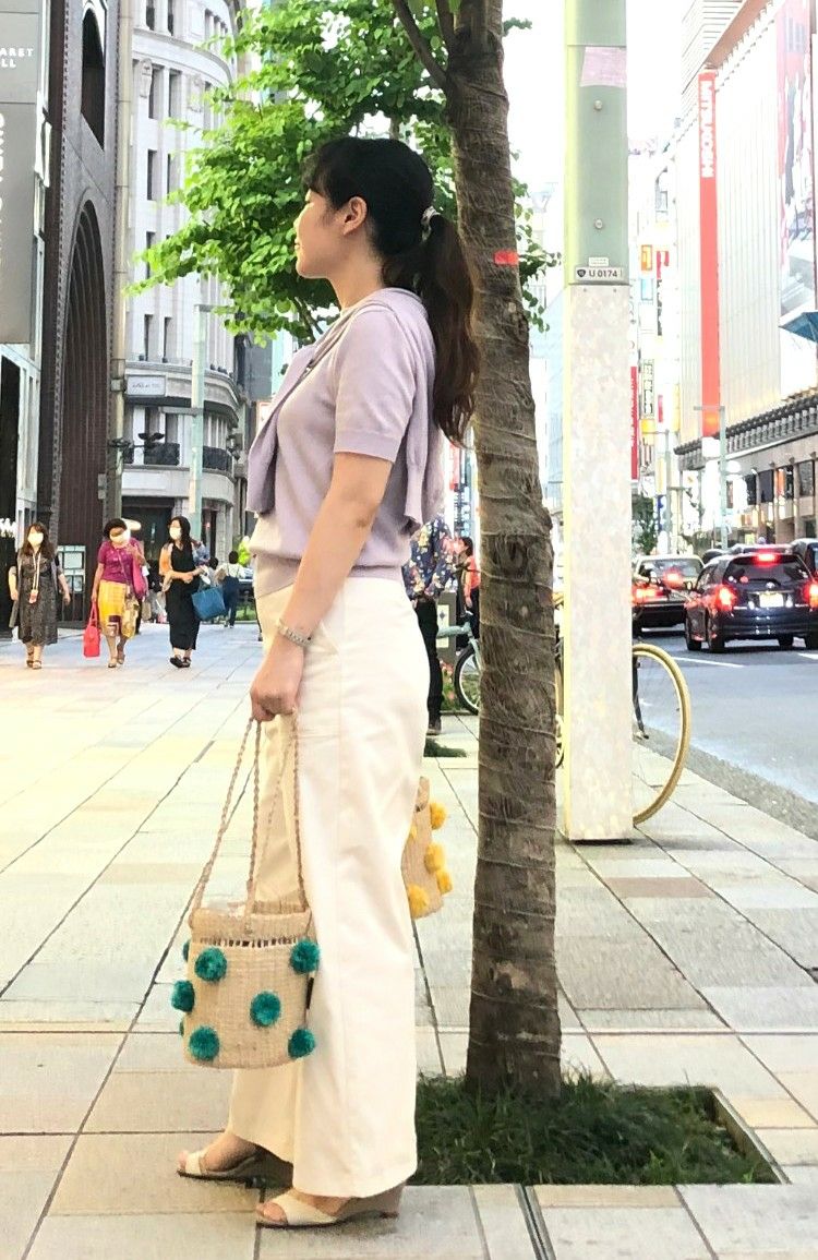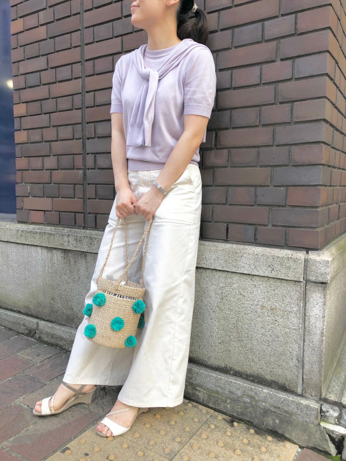 ポンポンにインパクトがあるので、無地のノースリーブニットやシャツなど、シンプルな装いにオススメ◎