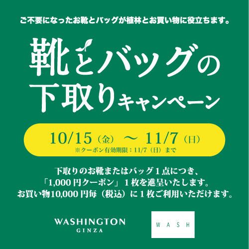 10月15日より11月7日まで靴とバッグの下取りキャンペーンを開催いたします。