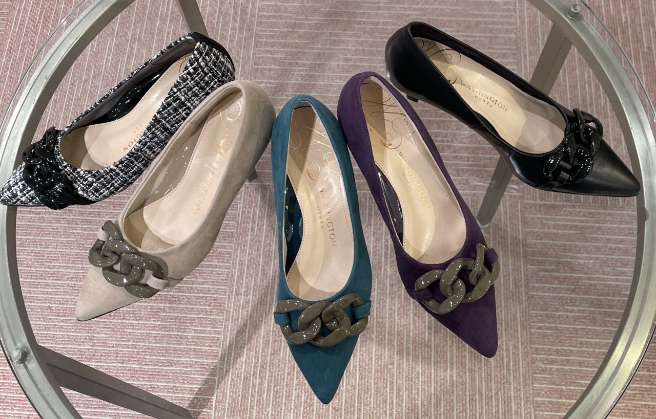 カラーパンプスでもスエードなので柔らかい印象でお履きいただけます。