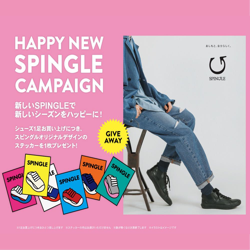 SPINGLEのシューズ1足お買い上げにつき、スピングルオリジナルデザインのステッカーを1枚プレゼントいたします。